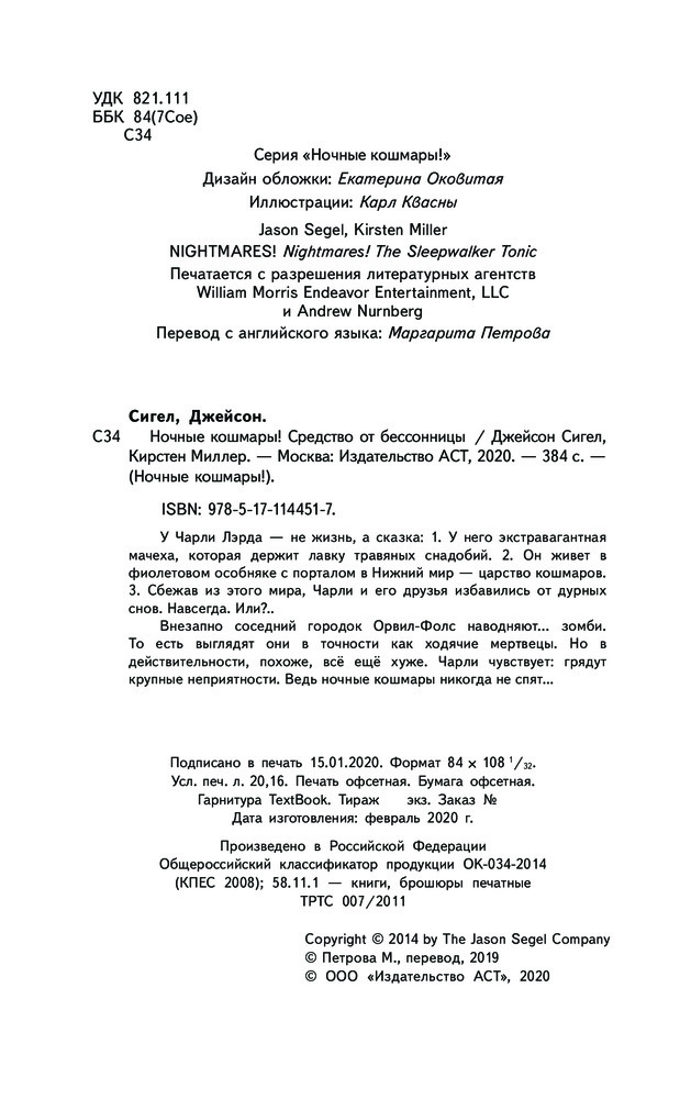 Ночные кошмары! Средство от бессонницыМиллер Кирстен , Джейсон Сигел В данный момент этот товар отсутствует в продаже. Возможно, у нас найдется аналогичный или похожий товар здесь. Серия: Ночные кошмары! У Чарли Лэрда — не жизнь, а сказка: 1. У него экстравагантная мачеха, которая держит лавку травяных снадобий. 2. Он живет в фиолетовом особняке с порталом в Нижний мир — царство кошмаров. 3. Сбежав из этого мира, Чарли и его друзья избавились от дурных снов. Навсегда. Или?.. |