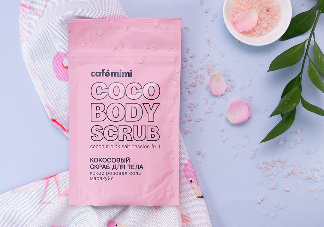 Cafe mimi Скраб для тела кокосовый с розовой солью и маракуйей