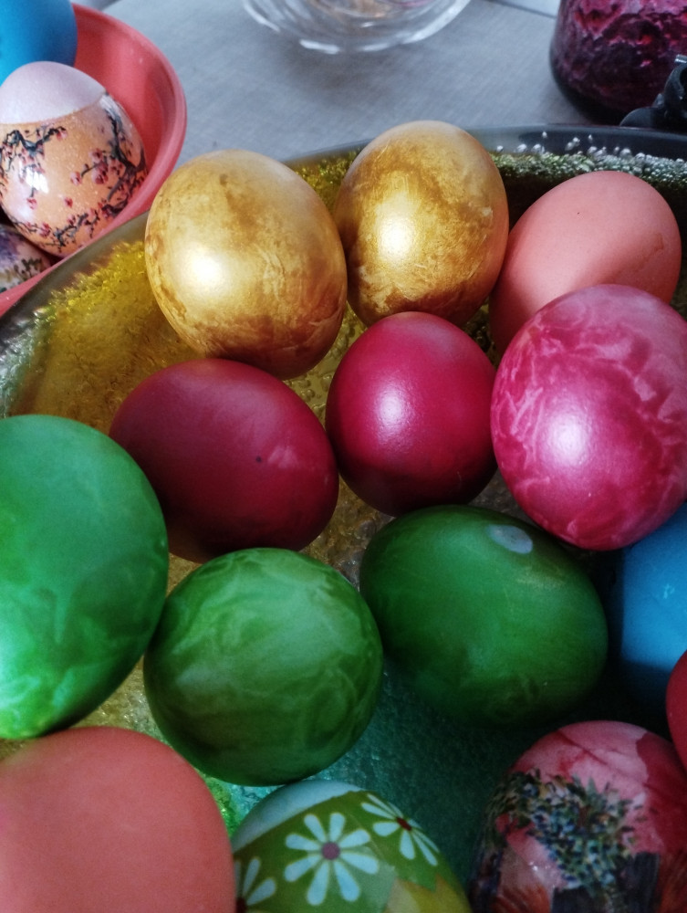 У меня был набор: красный жёлтый зелёный. Я сначала красила ещё белые яички, а потом решила помазать уже готовые. Крашенные яйца приобрели красивый перламутровый оттенок.