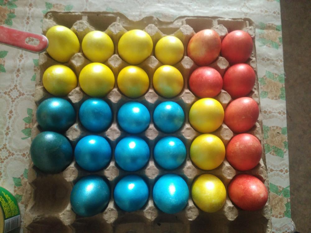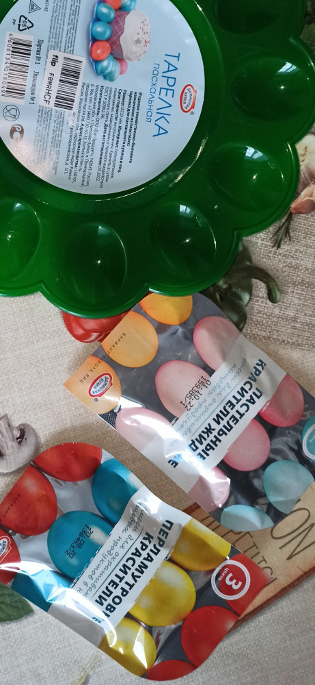 отличные красители, брали сразу несколько пачек разных цветов. Если приноровиться никаких разводов не будет, однородные, блестящие яйца. обязательно красить на горячие. после покраски липнут к рукам, но это не страшно)