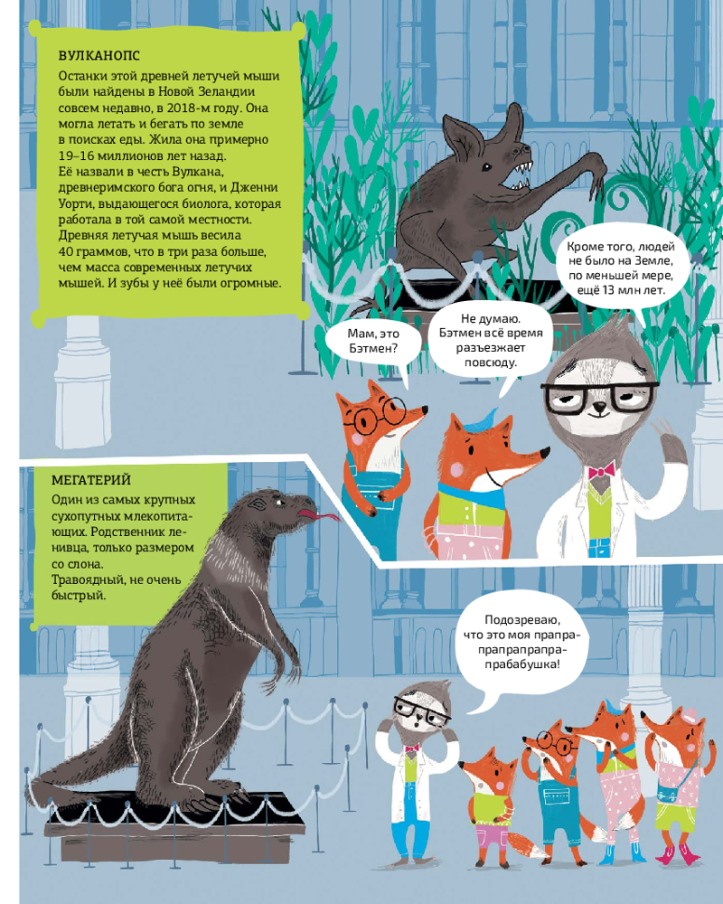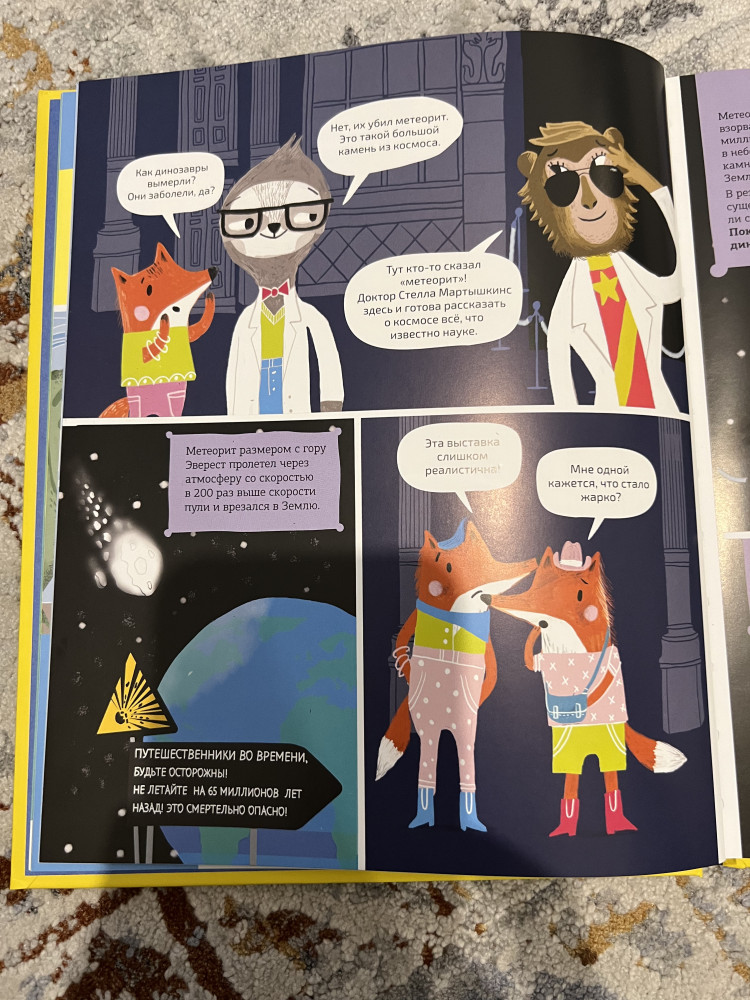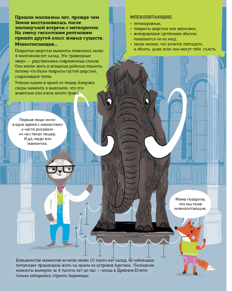 Заказала ее из-за яркой обложки сыну (3,5 года). Он любитель мамонтов и динозавров. В итоге в книге очень мало иллюстраций самих мамонтов и динозавров. Она больше идет как научно-познавательный комикс от 3 лица . Для больших, читающих детей думаю самое то, но для малышей как мой не подойдет