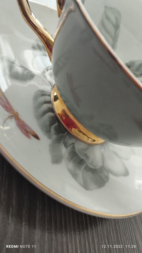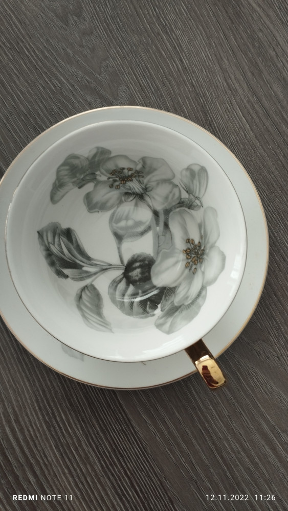 Очень красивая пара. К сожалению, у блюдца небольшой дефект эмали на ободке, не критично. Действительно, необходимо проверять при доставке.