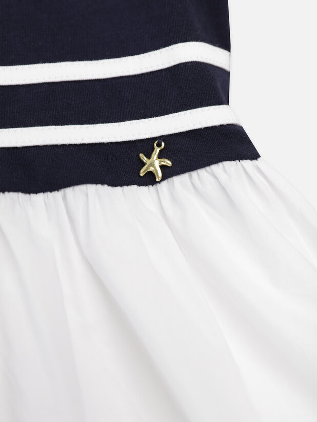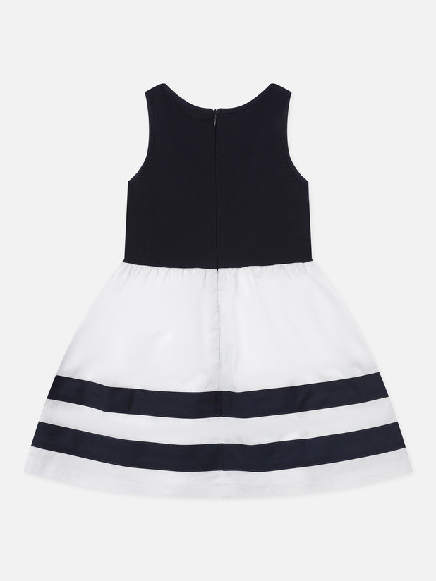 Платье супер! Как с моего детства. Простое и элегантное одновременно. Синий материал верха- нежнейший трикотаж. Белые вставки на нижней юбке платья из белоснежнего батиста. Но надо брать на размер больше, мы вернули с огромным сожалением :((( Дочке вот-вот, без малейшего запаса на вырост летом. Перезакажу на больший размер.