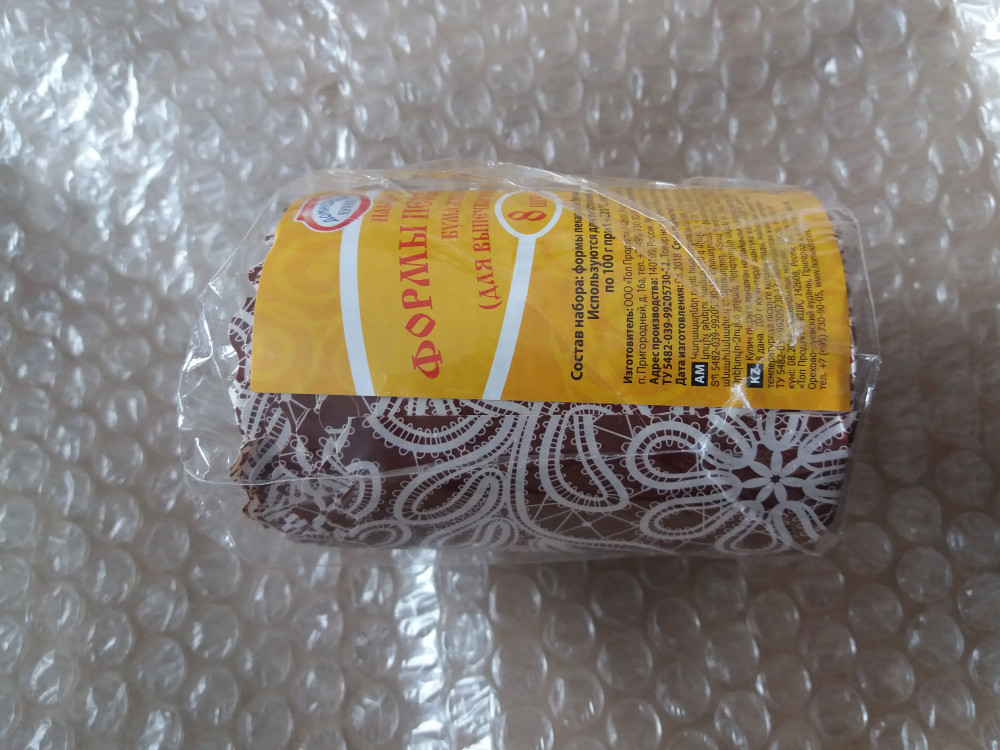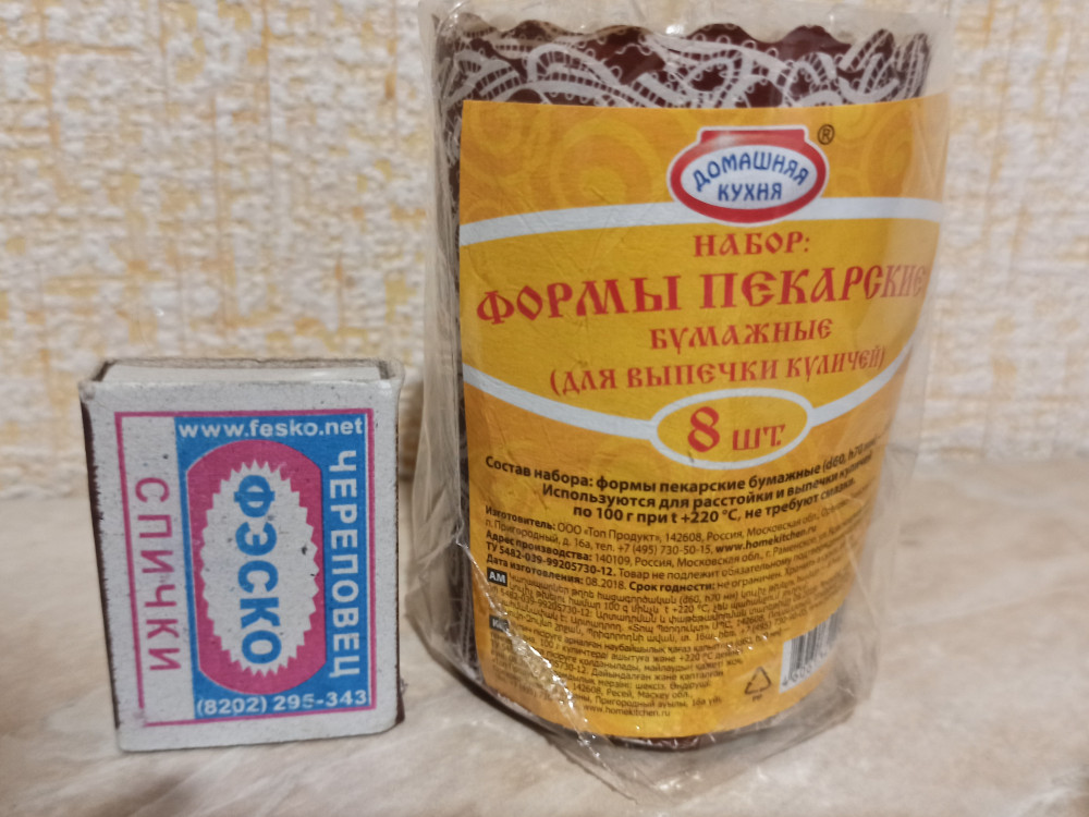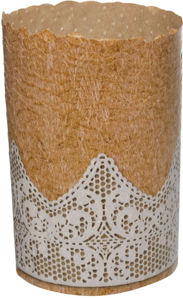 Миленькая формочки 8 штук, размер донышка чуть меньше ладошки, как раз на один маленький пасхальный куличик для ребенка, вид крафтовой бумаги с миленьким кружевом по низу, прелесть. Хорошего качества. Спасибо Flip.