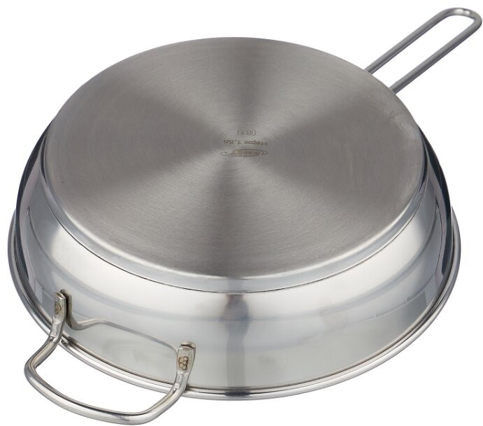 Сковорода предназначена для приготовления пищи, долговечна и неприхотлива в эксплуатации. Изготавливается из нержавеющей (коррозионностойкой) стали согласно ГОСТ, поэтому гигиенична и безопасна для здоровья вашей семьи. Процесс приготовления займет меньше времени и уменьшит затраты на газ или электричество, за счет трехслойного теплораспределительного дна. Нержавеющая сталь обладает малой теплопроводностью, поэтому посуда из нее остывает гораздо медленнее, чем любой другой вид посуды, а значит, приготовленное в ней более длительное время остается горячим.