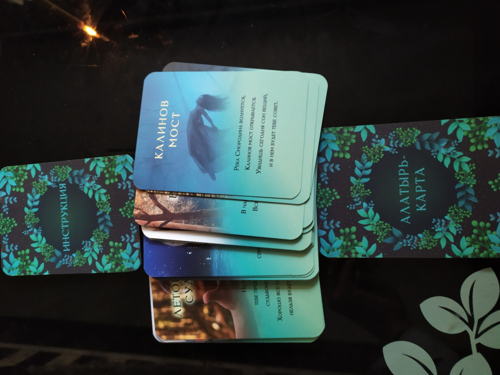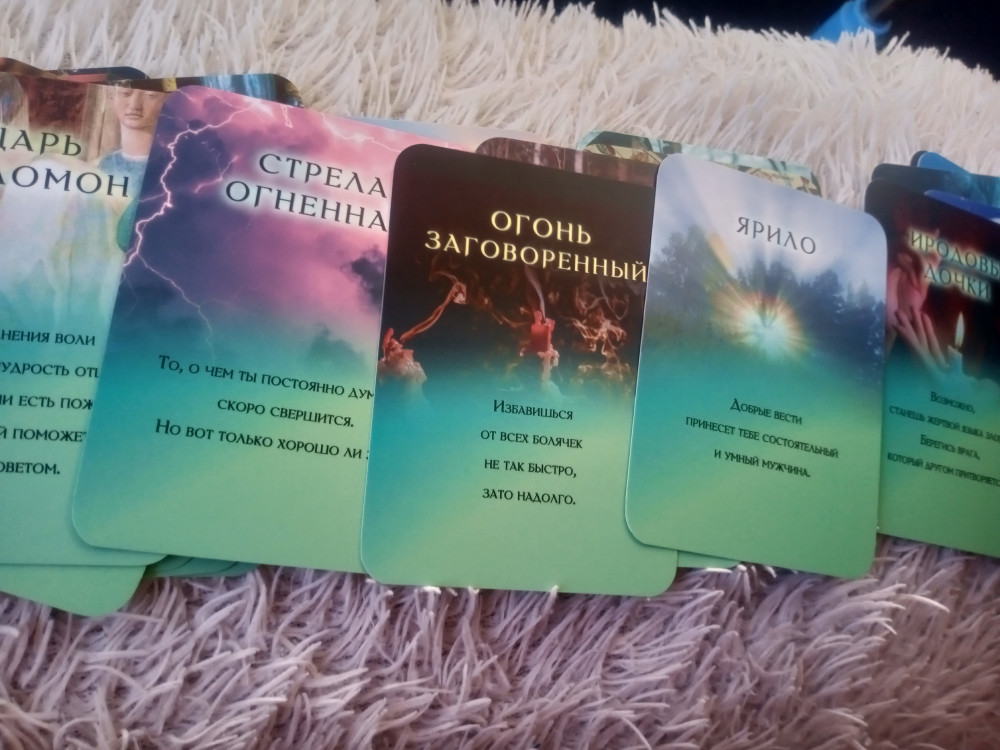 в целом карты очень хороши и по смыслу и по говорливости, мне очень понравились, картон правда, тонковатый, но в целом карты неплохие, советую, в комплекте все было и инструкция и Алатырь карта, карты были запечатаны в пленку.
