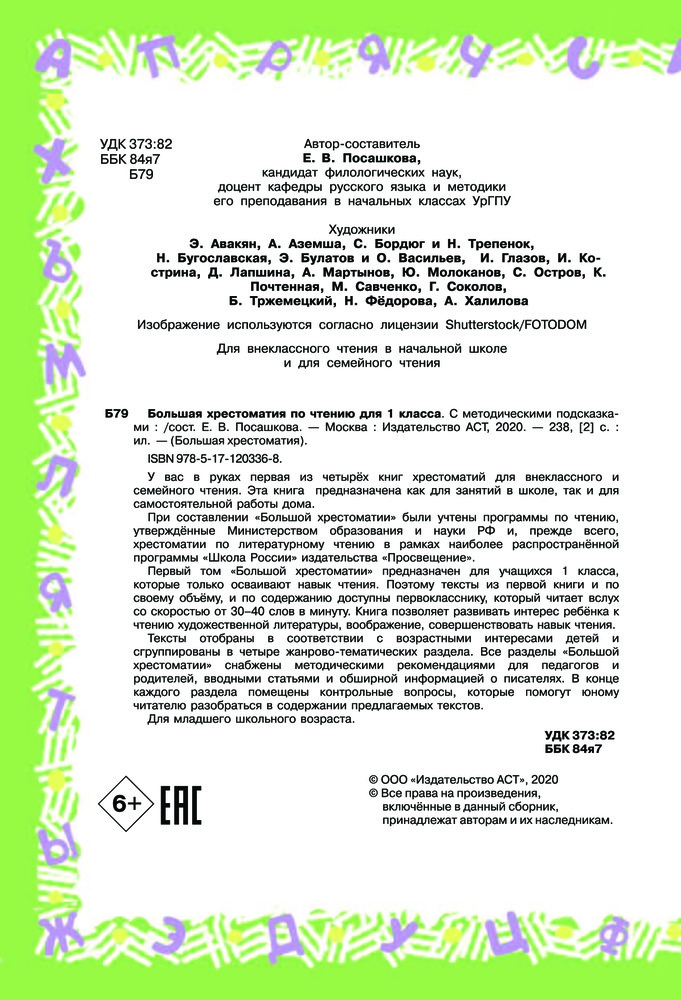 💳 Оплатить за товар можно при получении 🇰🇿 Есть бесплатная доставка по Казахстану от 1 дня 🎁 Копите бонусы с каждой покупки Серия: Большая хрестоматия Уважаемые взрослые, дорогие ребята! Вы держите в руках первую из четырёх книг для внеклассного и семейного чтения. Эта книга подойдёт как для занятий в школе, так и для самостоятельной работы дома. Эта хрестоматия предназначена для 1 класса, то есть для детей 6–7 лет, которые только осваивают навык чтения. Поэтому в первой книге собраны увлекательные, но небольшие произведения, которые может осилить начинающий читатель. Вторая, третья и четвёртая книги хрестоматии предназначены для учащихся 2–4 классов. В отличие от других пособий для начальной школы, в нашу хрестоматию включены не только тексты художественных произведений, но и статьи о писателях, вопросы и задания к текстам для юных читателей, методические подсказки для взрослых. Автор-составитель хрестоматии — Е. В. Посашкова,кандидат филологических наук, широко известный специалист в области русского языка и методики его преподавания в начальной школе. Надеемся, что с помощью нашей книги маленький читатель совершит самостоятельное путешествие в увлекательный мир литературы, научится вместе с героями книг думать, фантазировать, творить. И тогда перед ним откроется огромная и удивительная страна, населённая поэтами,сказочниками, весёлыми и добрыми людьми... |
