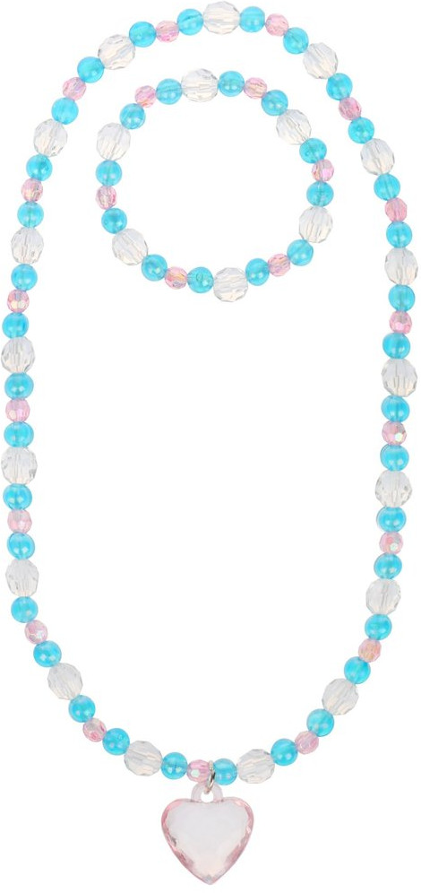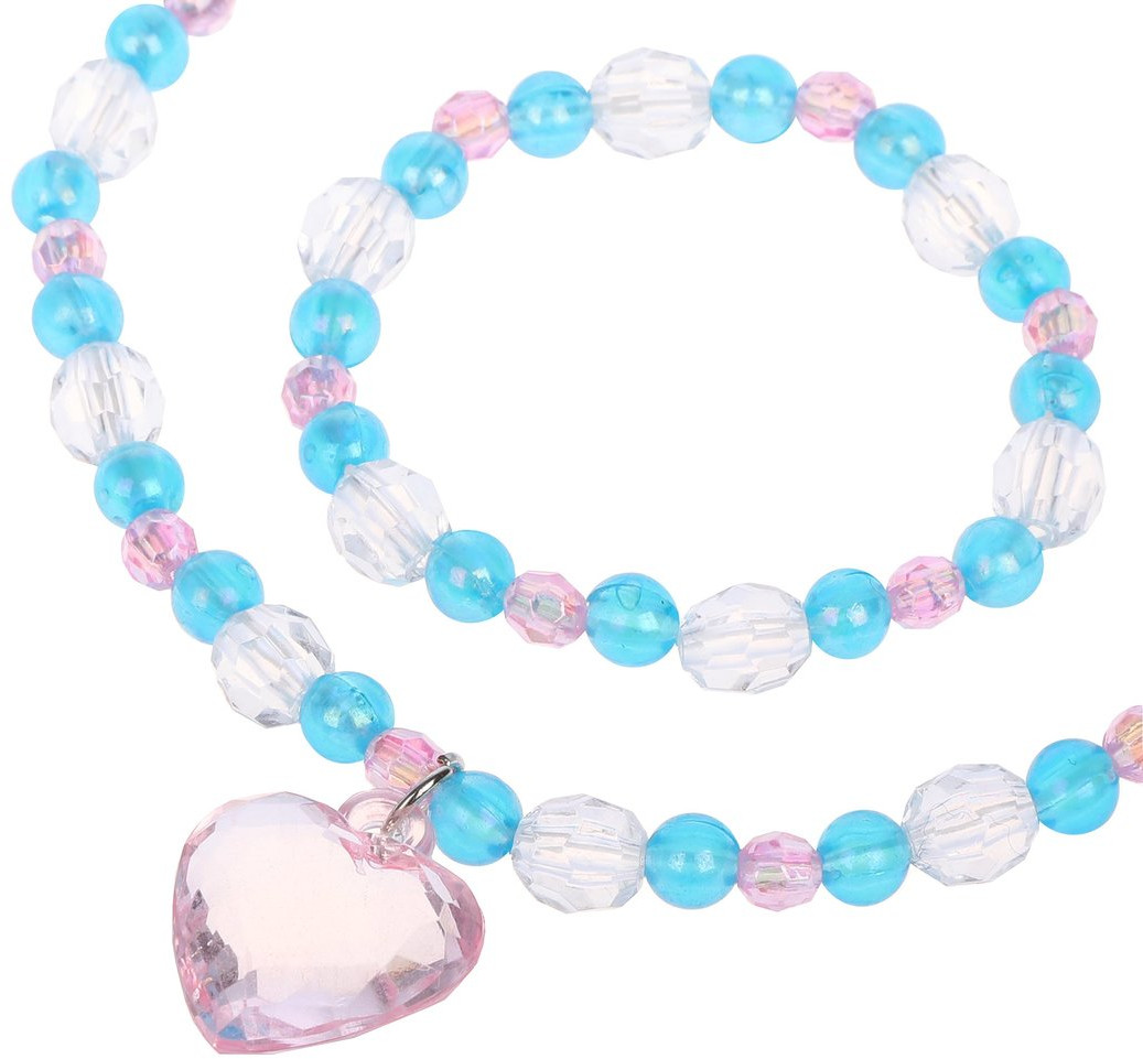 В комплекте — бусы с подвеской-сердцем и браслет. Украшения сделаны из бусин нежно-розового, небесно-голубого и белого цвета. Эти стильные аксессуары будут прекрасно сочетаться с большинством нарядов юной леди. Длина бус: 20 см 1/2 (тянется), длина браслета: 6,5 см 1/2 длины (тянется).