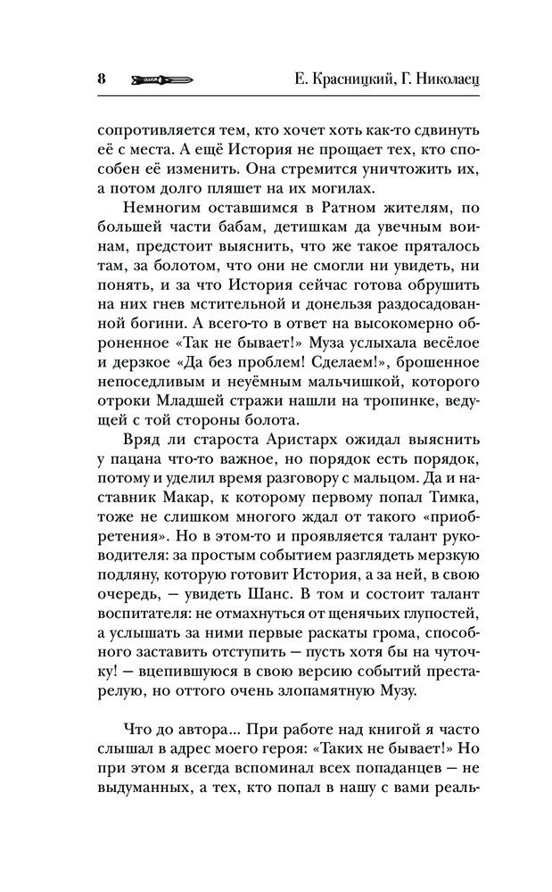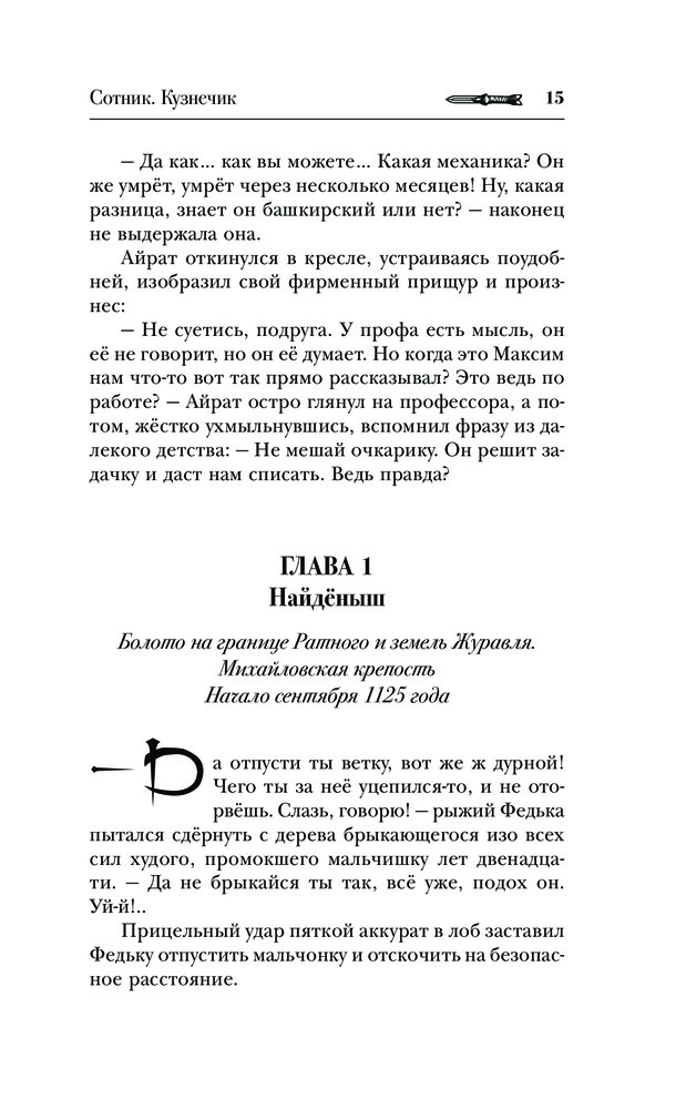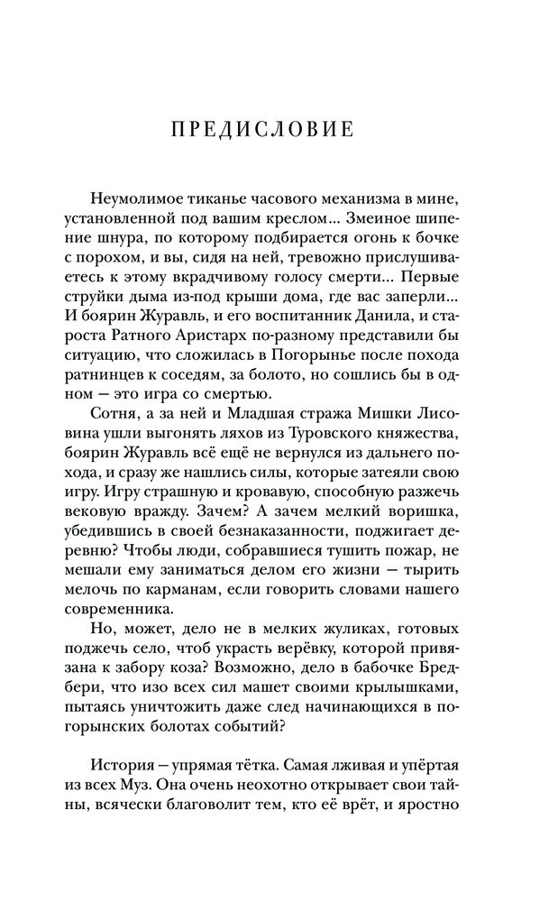 Потому к Мишке на беседу Тимка так и не попал. Вначале бояричу было просто не до него, а потом — почти сразу — на Ратное напали ляхи, и пришлось Михаилу Ратникову уйти в поход, так и не узнав, что за мина замедленного действия из-за болота осталась у него в крепости. И как она «рванёт» без должного присмотра. А разгребать всё это досталось старосте Аристарху, что само по себе сулило бояричу дополнительную головную боль после возвращения — отвечать на непростые вопросы и расплетать заковыристые узлы, каковые при Тимкином активном участии непременно заплетутся и в мозгах, и судьбах обитателей крепости. |
