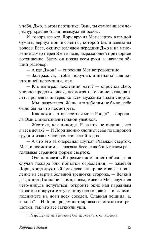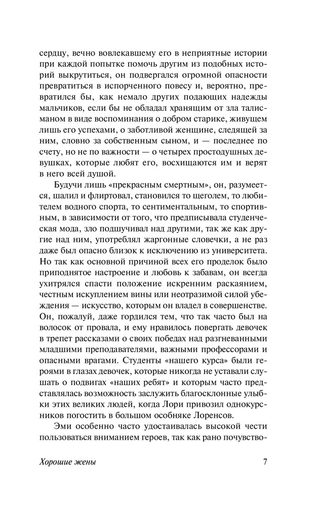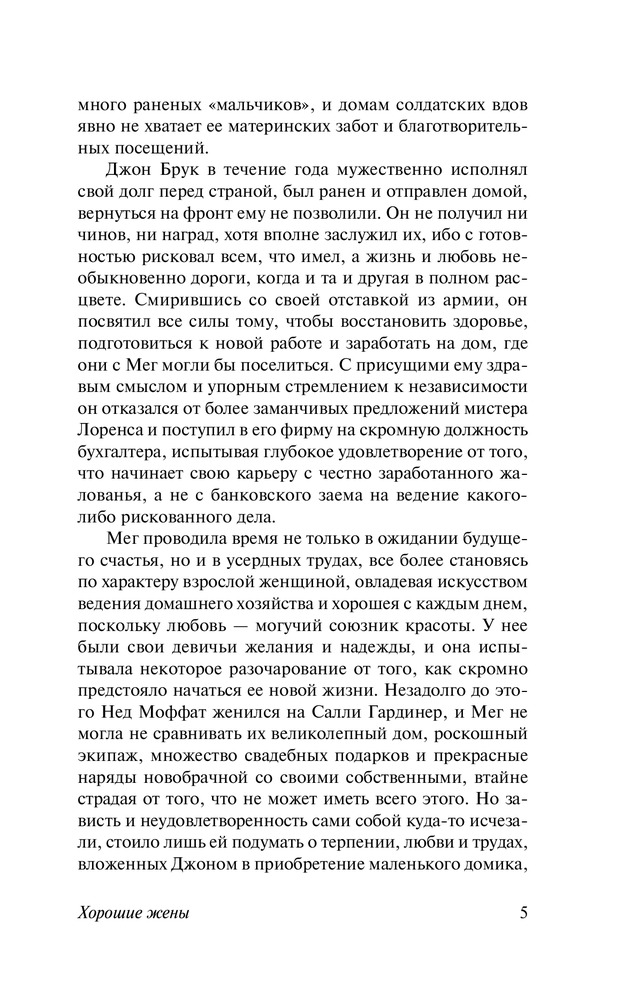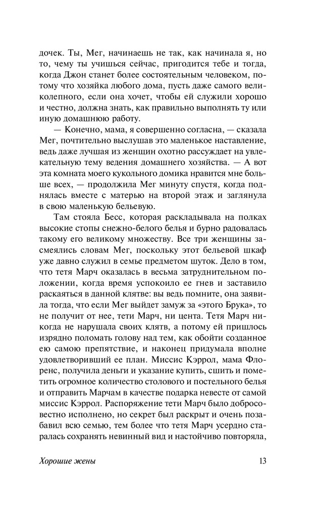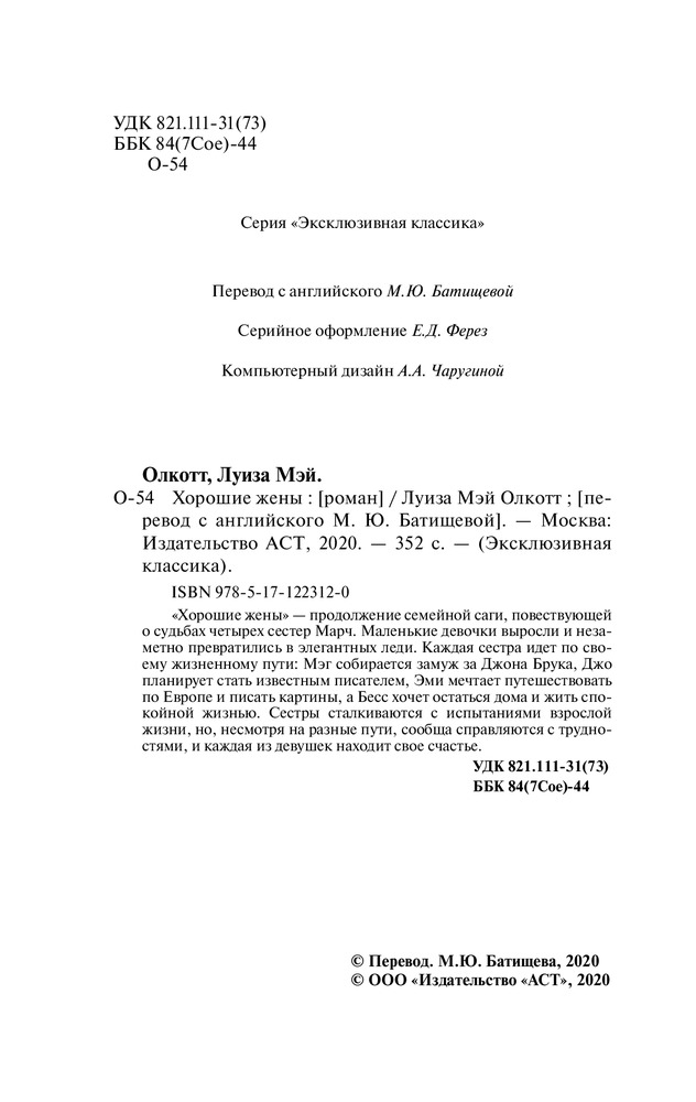 Хорошие женыВ данный момент этот товар отсутствует в продаже. Возможно, у нас найдется аналогичный или похожий товар здесь. Серия: Эксклюзивная классика Луиза Мэй Олкотт (1832 — 1888) выросла в «литературной семье», в окружении знаменитых поэтов, писателей и философов. И первый же ее роман, опубликованный в 1868 году и носящий во многом автобиографический характер, — «Маленькие женщины» — не просто стал сенсацией своего времени, но обессмертил имя писательницы навеки. Впоследствии Олкотт снова и снова обращалась к дальнейшим судьбам героинь этого романа, создав первую в американской литературе «семейную сагу» — тетралогию «Маленькие женщины», «Хорошие жены», «Маленькие мужчины» и «Ребята Джо». «Хорошие жены» — продолжение семейной саги, повествующей о судьбах четырех сестер Марч. Маленькие девочки выросли и незаметно превратились в элегантных леди. Каждая сестра идет по своему жизненному пути: Мэг собирается замуж за Джона Брука, Джо планирует стать известным писателем, Эми мечтает путешествовать по Европе и писать картины, а Бесс хочет остаться дома и жить спокойной жизнью. Сестры сталкиваются с испытаниями взрослой жизни, но, несмотря на разные пути, сообща справляются с трудностями, и каждая из девушек находит свое счастье. |
