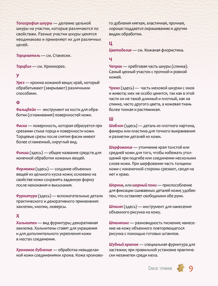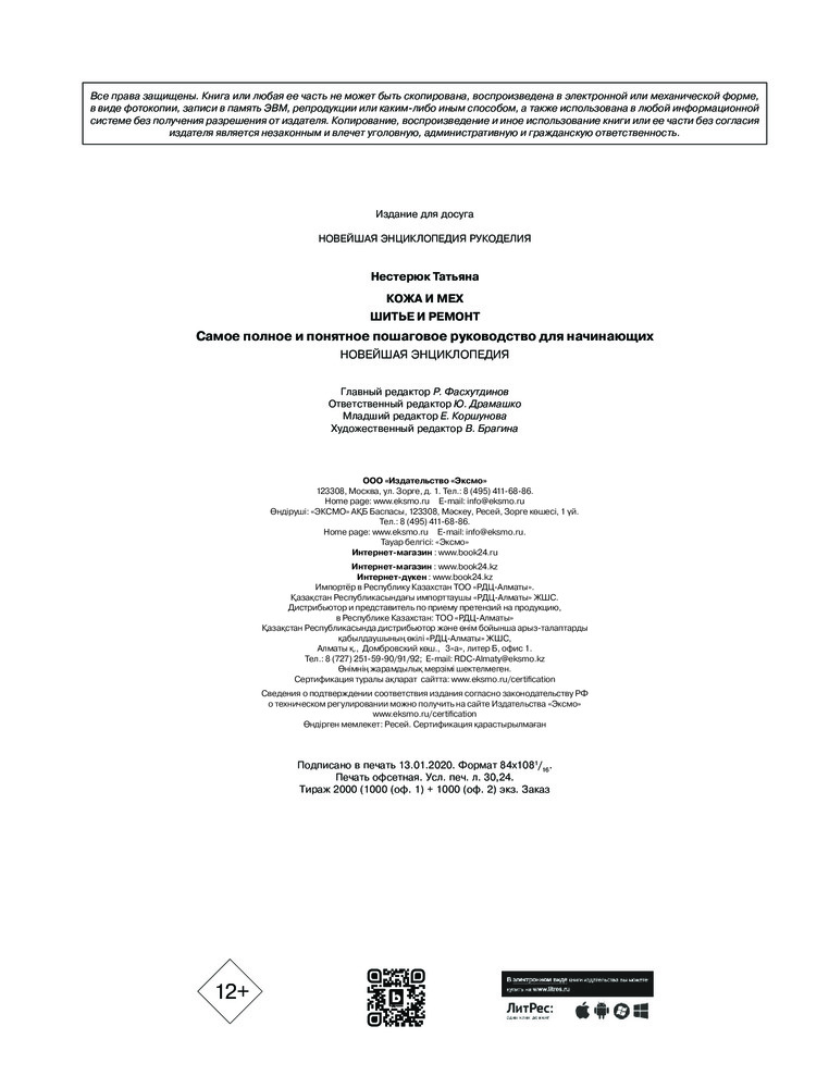Новая книга серии «Новейшая энциклопедия рукоделия» с легкостью решит все эти проблемы. В подробных, отлично проиллюстрированных мастер-классах авторы расскажут и покажут, как выбрать кожу или мех, сориентируют в приобретении нужных инструментов, помогут разобраться в море фурнитуры, научат правильно отрезать, сшить, подшить или создать элегантный чехол для телефона, браслет или даже сумку. Подшить рукава шубы, поставить аккуратную заплатку, и многое-многое другое! Книга очень практична, но при этом будит фантазию и побуждает к творчеству. Кто знает, может из-под ваших рук выйдут оригинальные игрушки или даже одежда. В любом случае бесценные и редкие навыки останутся с вами на всю жизнь! |