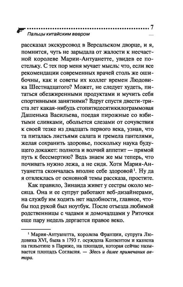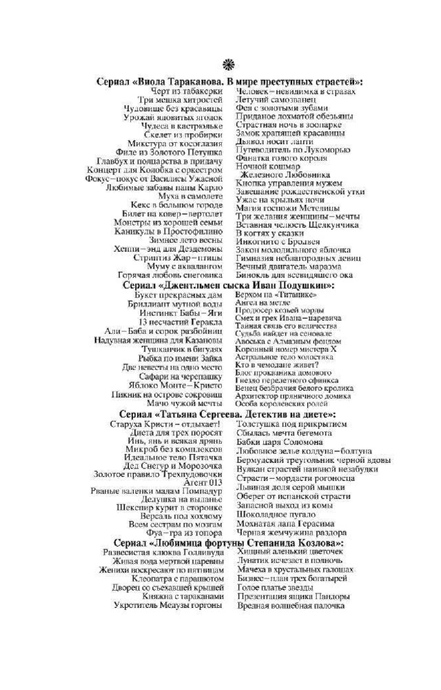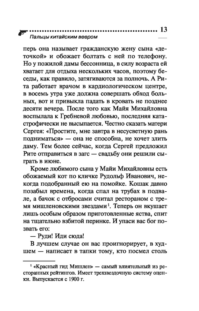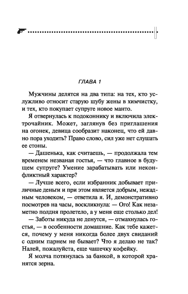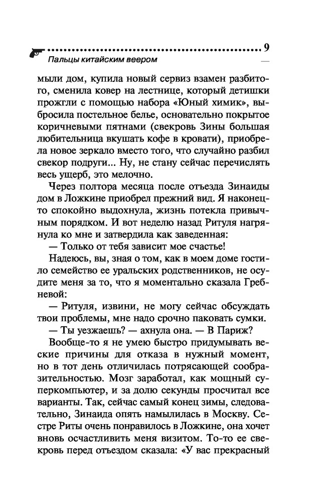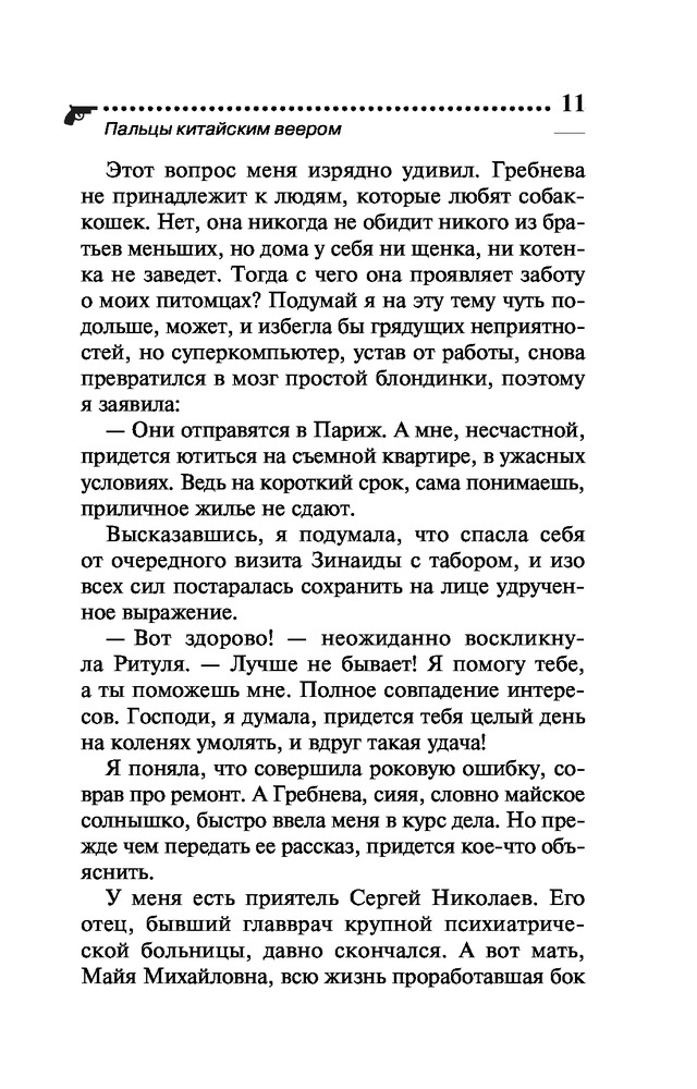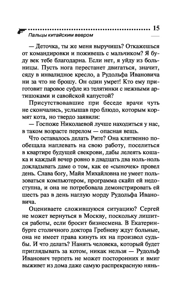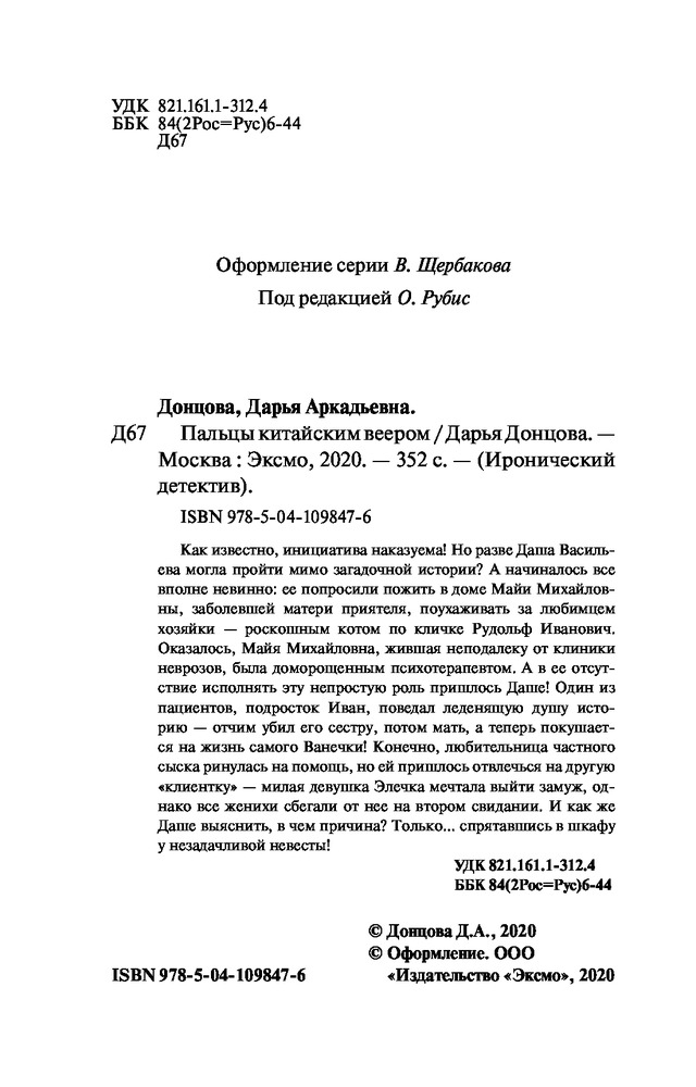 Пальцы китайским вееромВ данный момент этот товар отсутствует в продаже. Возможно, у нас найдется аналогичный или похожий товар здесь. Серия: Иронический детектив Д. Донцовой (новая суперэконом-серия) (обложка) Как известно, инициатива наказуема! Но разве Даша Васильева могла пройти мимо загадочной истории? А начиналось все вполне невинно: ее попросили пожить в доме Майи Михайловны, заболевшей матери приятеля, поухаживать за любимцем хозяйки — роскошным котом по кличке Рудольф Иванович. Оказалось, Майя Михайловна, жившая неподалеку от клиники неврозов, была доморощенным психотерапевтом. А в ее отсутствие исполнять эту непростую роль пришлось Даше! Один из пациентов, подросток Иван, поведал леденящую душу историю — отчим убил его сестру, потом мать, а теперь покушается на жизнь самого Ванечки! Конечно, любительница частного сыска ринулась на помощь, но ей пришлось отвлечься на другую «клиентку» — милая девушка Элечка мечтала выйти замуж, однако все женихи сбегали от нее на втором свидании. И как же Даше выяснить, в чем причина? Только... спрятавшись в шкафу у незадачливой невесты! |