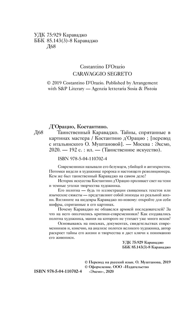 Серия: Таинственное искусство Современники называли его безумцем, убийцей и антихристом. Потомки видели в художнике пророка и настоящего революционера. Кем же был таинственный Караваджо на самом деле? Историк искусства Костантино д’Орацио проливает свет на тени и темные уголки творчества художника. Его полотна — будь то иллюстрации священных текстов или языческие сюжеты — представляют собой эпизоды из реальной жизни. Взгляните на шедевры Караваджо по-новому: откройте для себя шифры, спрятанные в его картинах. Почему Караваджо не обзавелся армией последователей? За что на него ополчились критики-современники? Как создавались полотна художника, мания на которого не утихает уже много веков? Основываясь на письмах, документах, свидетельствах современников и, конечно, на анализе полотен великого художника, автор раскроет тайны его жизни и творчества и даст ключи к пониманию его живописи. |
