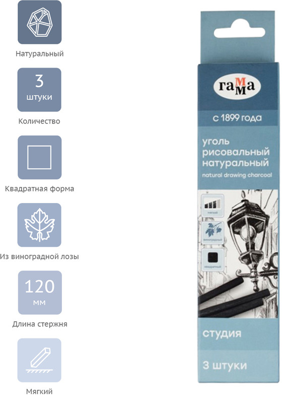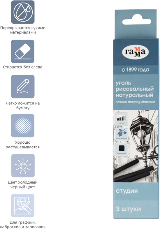 Натуральный виноградный уголь для рисования предназначен для графики, выполнения набросков, зарисовок. На бумаге оставляет штрих холодного черного цвета. Стержень имеет квадратное сечение. Легко ложится на различные текстуры бумаги, холста.
