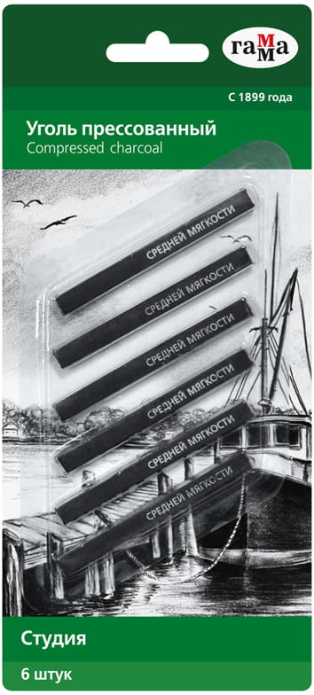 Прессованный уголь оставляет на бумаге насыщенный черный штрих. Плоскостью бруска можно создать широкие линии и закрасить большую поверхность. Стержень имеет квадратное сечение. Легко ложится на различные текстуры бумаги, холста.