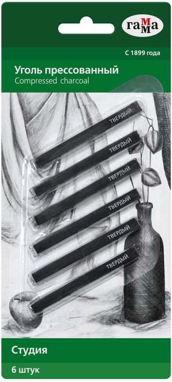 Прессованный уголь оставляет на бумаге насыщенный черный штрих. Плоскостью бруска можно создать широкие линии и закрасить большую поверхность. Стержень имеет квадратное сечение. Легко ложится на различные текстуры бумаги, холста.