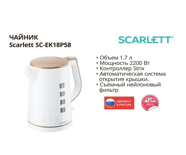 Получила недавно чайник, уже попила любимый Бариста кофе из него. Очень довольна покупкой! Чайник очень стильный, всё по описанию сходится, "шумит при закипании" - приятно, выключается - почти бесшумно. Закипает быстро. Вкуса пластмассы не обнаружено. Кнопка включения чайника Scarlett SC-EK18P58 (находящаяся, ближе к основанию), светится неоновым голубым светом - очень красиво. Так же у чайника имеется поворот на 360º и в носике чайника, предусмотрено фильтрующее ситечко. К покупке рекомендую. Спасибо, Флип. кз.