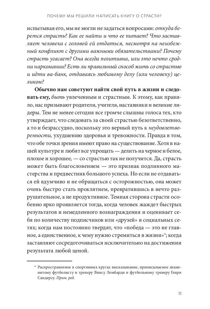 Гори, но не сгорай. Как пойти ва-банк, добиться успеха и наслаждаться жизнью без балансаВ данный момент этот товар отсутствует в продаже. Возможно, у нас найдется аналогичный или похожий товар здесь. Серия: МИФ. Личное развитие Наблюдая за драйвом спортсменов-олимпийцев, изобретателей-новаторов, креативных художников и преуспевающих предпринимателей, а также переживая это чувство в своей душе, авторы задались вопросами: откуда берется страсть и что ее питает? Как найти ее в своей жизни? Как человек принимает решение с головой отдаться увлечению? Ведь оно нередко вступает в конфликт с другими важными обязательствами. Почему страсть угасает? Всегда ли это чувство позитивно? А может, такое состояние не сильно отличается от пагубной зависимости, подобной наркомании? Всегда ли правильно жить со страстью и идти ва-банк, отдаваясь любимому делу (или человеку) целиком? |