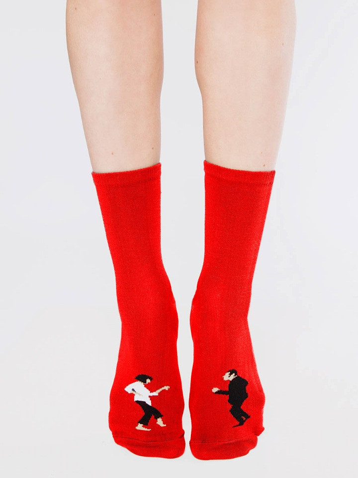 Носочки хорошие. Но купила из за персонажей если честно)) знаменитый и всеми любимый кадр из фильма "Криминальное чтиво"- Квентин Тарантино 1994, танец Джон Траволты и Ума Турман)) Идея 👌