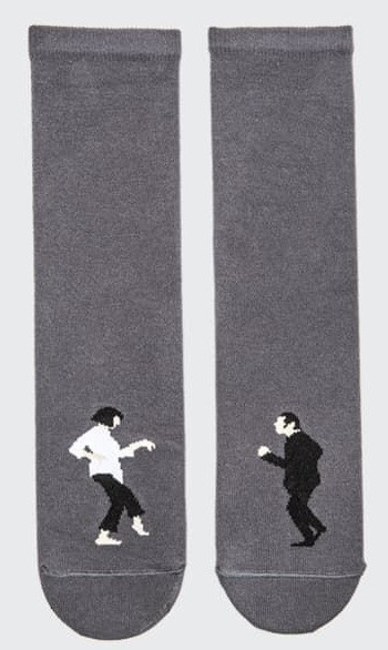 Носочки хорошие. Но купила из за персонажей если честно)) знаменитый и всеми любимый кадр из фильма "Криминальное чтиво"- Квентин Тарантино 1994, танец Джон Траволты и Ума Турман)) Идея 👌