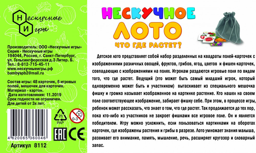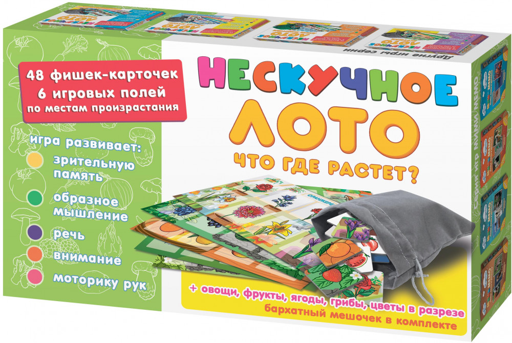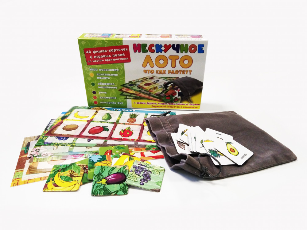 Нескучные игры Лото детское «Что где растет?»В данный момент этот товар отсутствует в продаже. Возможно, у нас найдется аналогичный или похожий товар здесь. Серия: Нескучное лото Детское лото представляет собой набор разделенных на квадраты полей-карточек с изображениями различных овощей, фруктов, грибов, ягод, цветов и фишек-карточек, совпадающих с изображениями на полях. Игрокам раздаются игровые поля по видам того, что где растет. Ведущий (это может быть самый младший игрок, который одновременно может быть и участником), вытаскивает из специального мешочка фишку и громко называет изображенное на картинке растение. |