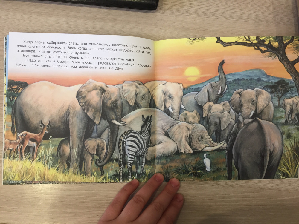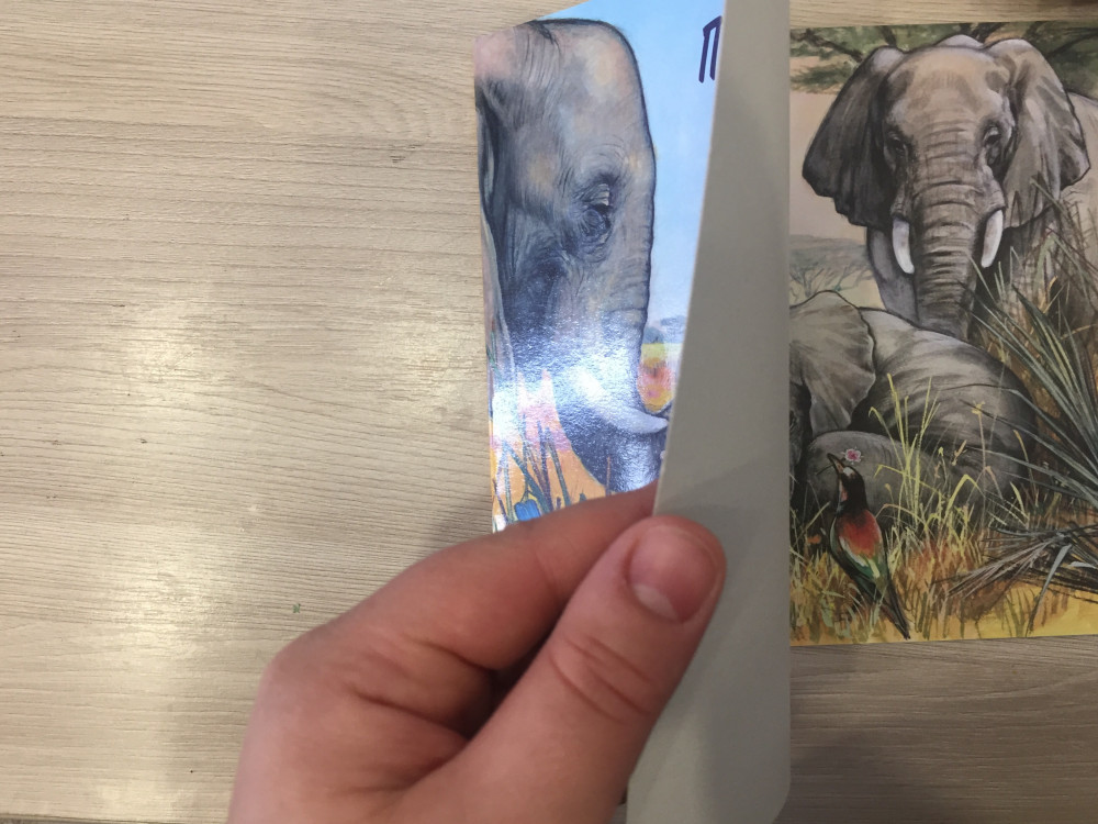 Какая это потрясающая книга! Взяла ребёнку про слонёнка, так как любит слонов смотреть везде. Теперь непременно нужно всю коллекцию! Обложка глянец, картон плотный. Сами страницы матовые, плотные. Очень довольна!