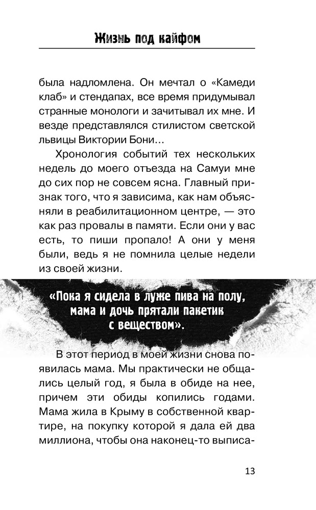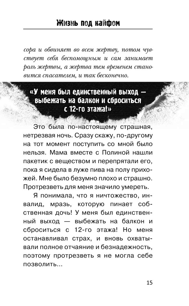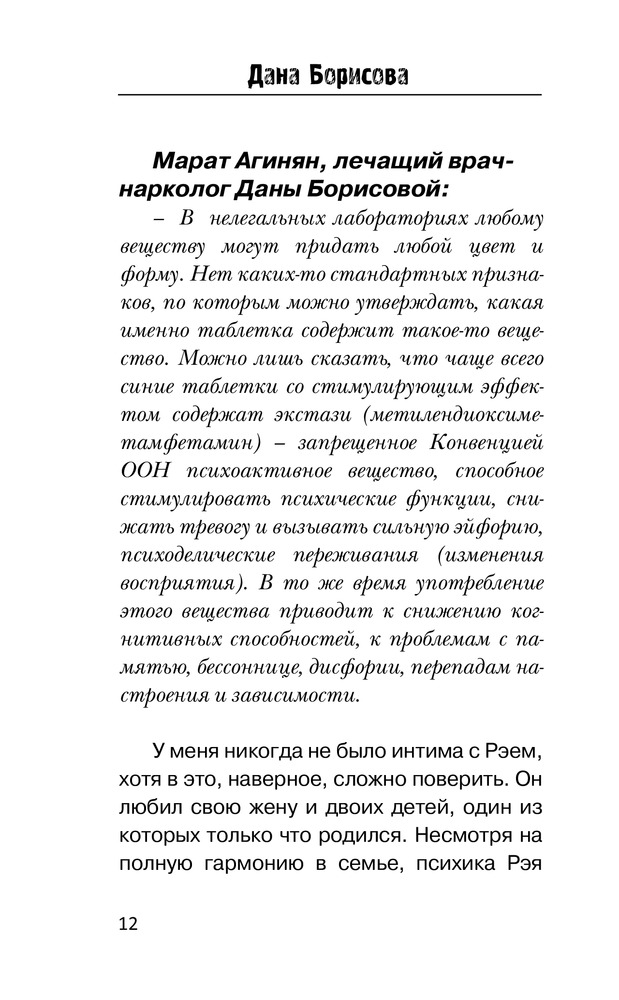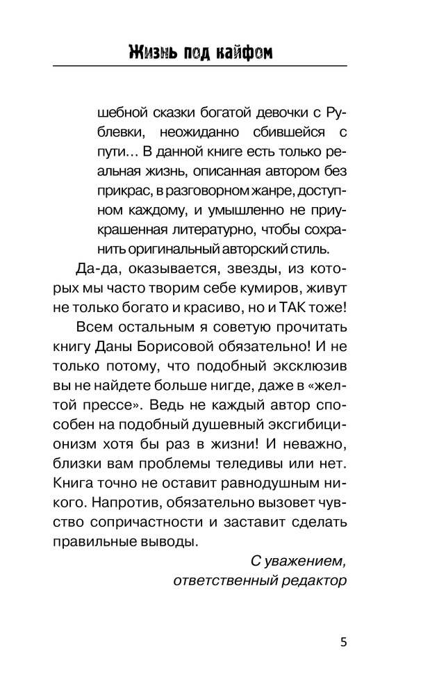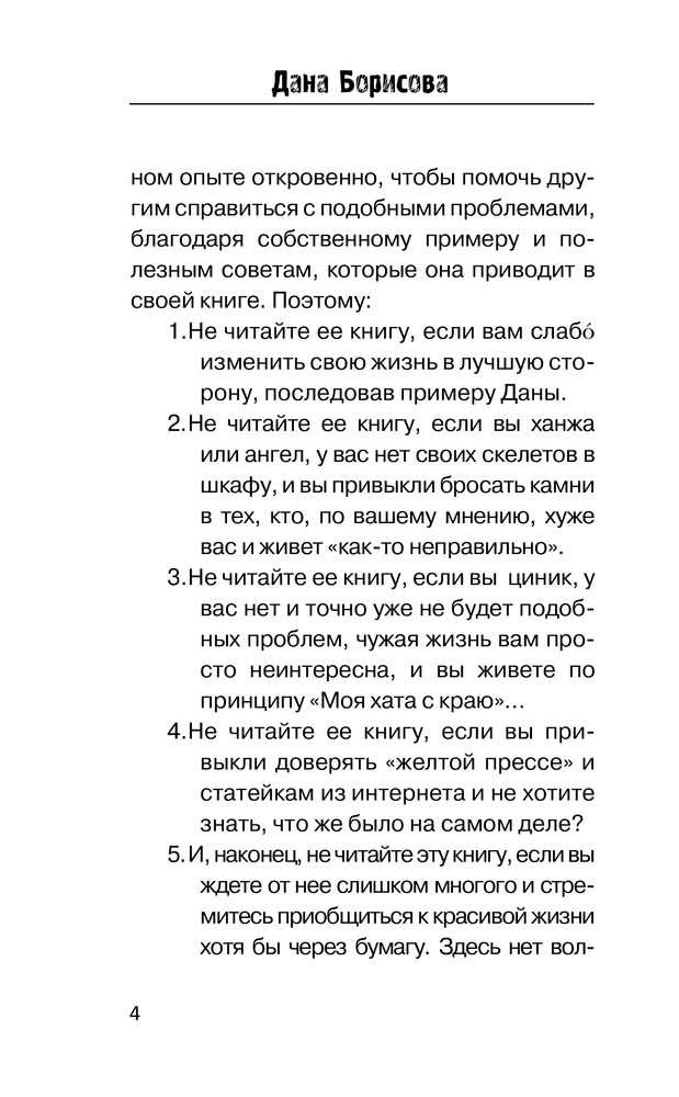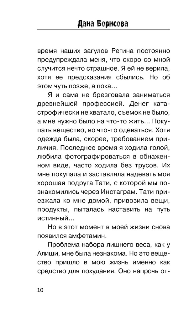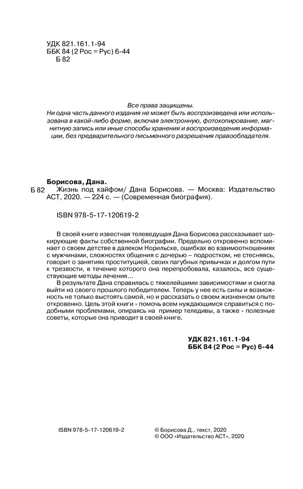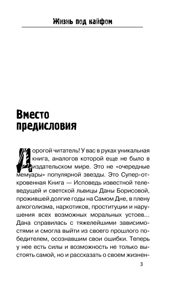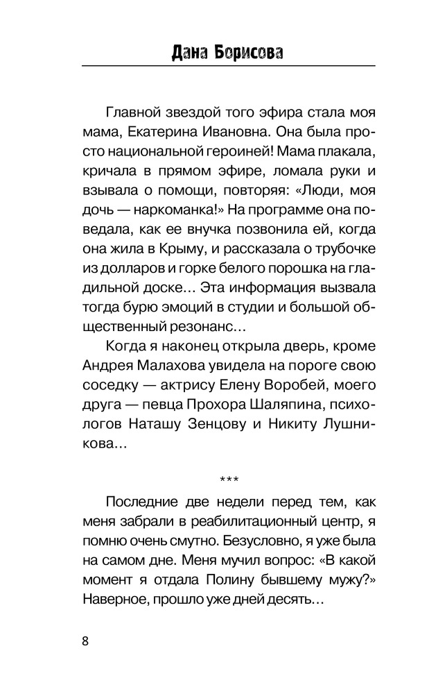 Серия: Современная биография В своей книге известная телеведущая Дана Борисова рассказывает шокирующие факты собственной биографии. Предельно откровенно вспоминает о своем детстве в далеком Норильске, ошибках во взаимоотношениях с мужчинами, сложностях общения с дочерью — подростком, не стесняясь, говорит о занятиях проституцией, своих пагубных привычках и долгом пути к трезвости, в течение которого она перепробовала, казалось бы, все существующие методы лечения... В результате Дана справилась с тяжелейшими зависимостями и смогла выйти из своего прошлого победителем. Теперь у нее есть силы и возможность не только выстоять самой, но и рассказать о своем жизненном опыте откровенно. Цель этой книги — помочь всем нуждающимся справиться с подобными проблемами, опираясь на пример теледивы, а также — полезные советы, которые она приводит в своей книге. Трогательная история жизни Даны Борисовой не оставит равнодушным никого. Напротив, вызовет чувство сопричастности и заставит читателей сделать правильные выводы. |