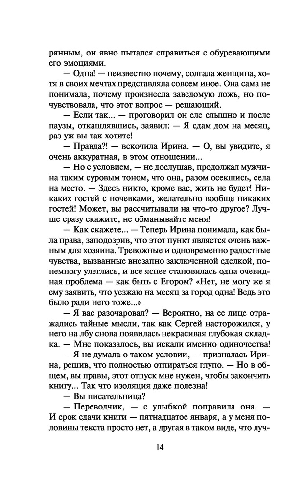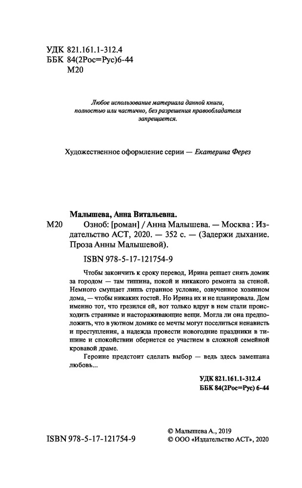 ОзнобВ данный момент этот товар отсутствует в продаже. Возможно, у нас найдется аналогичный или похожий товар здесь. Серия: Задержи дыхание. Проза Анны Малышевой Чтобы закончить к сроку перевод, Ирина решает снять домик за городом — там тишина, покой и никакого ремонта за стеной. Немного смущает лишь странное условие, озвученное хозяином дома, — чтобы никаких гостей. Но Ирина их и не планировала. Дом именно тот, что грезился ей, вот только вдруг в нем стали происходить странные и настораживающие вещи. Могла ли она предположить, что в уютном домике ее мечты могут поселиться ненависть и преступления, а надежда провести новогодние праздники в тишине и спокойствии обернется ее участием в сложной семейной кровавой драме. Героине предстоит сделать выбор — ведь здесь замешана любовь... |