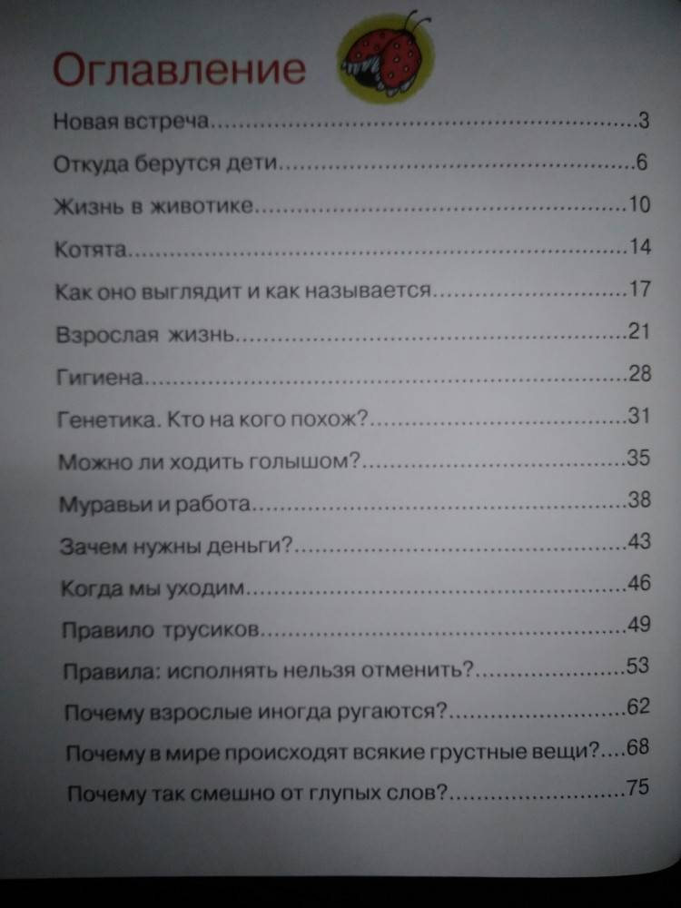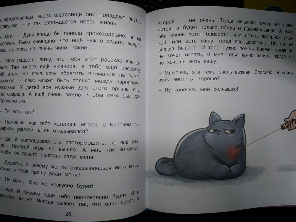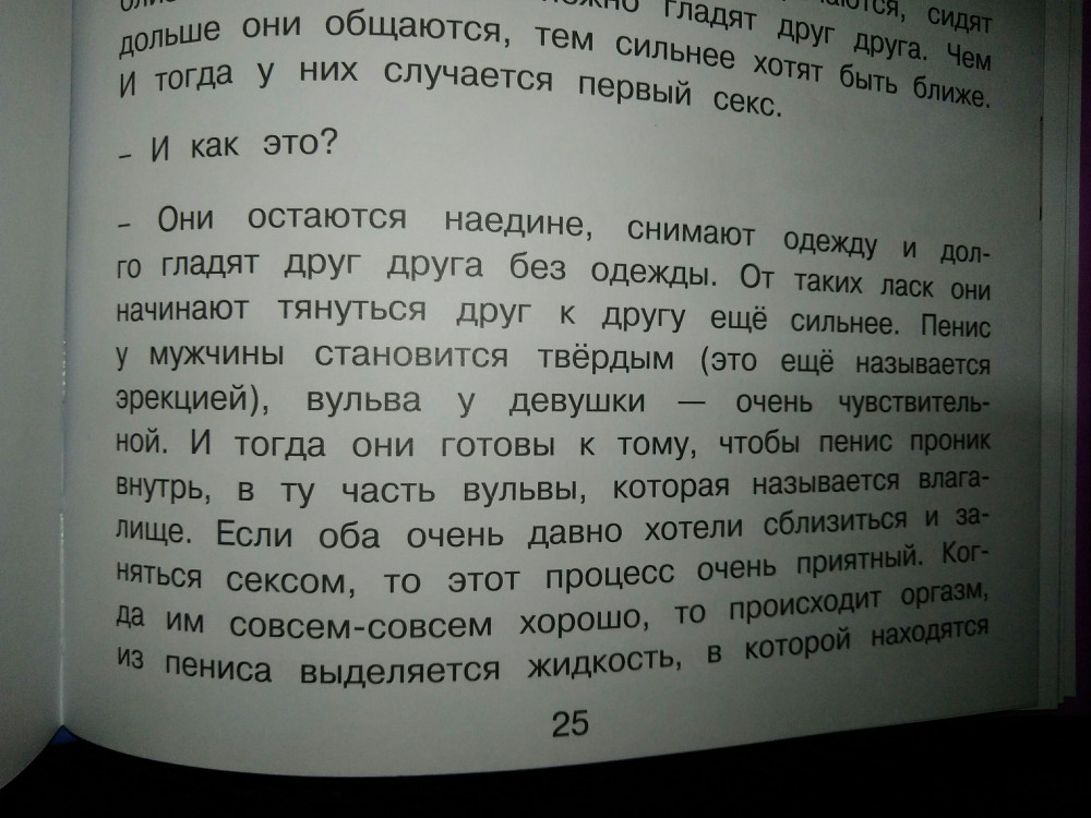 Очень не обычное чувство от книги, наверное это из детства, чувствуется смущение от прочитанного и увиденного, т к с нами в детстве никто таких книг не читал. Но однозначно книга ценна, так как очень сложно своим языком говорить на эту тему с ребенком. Нам 6 лет взяла именно для обозначения полов. Некоторые главы опустили на ,,потом ,,. Но лучше все это узнает дома и от родителей чем в школе от старшеклассников. Вида конечно не показываю ребенку, что смущаюсь. Ведь это обычные вещи которые все равно нужно объяснять своему малышу. А сейчас такой возраст когда они не сильно стесняются и не закрываются от таких тем.