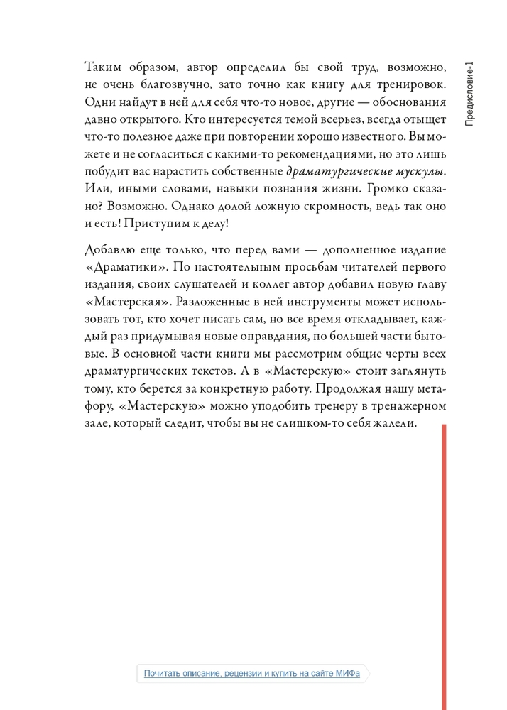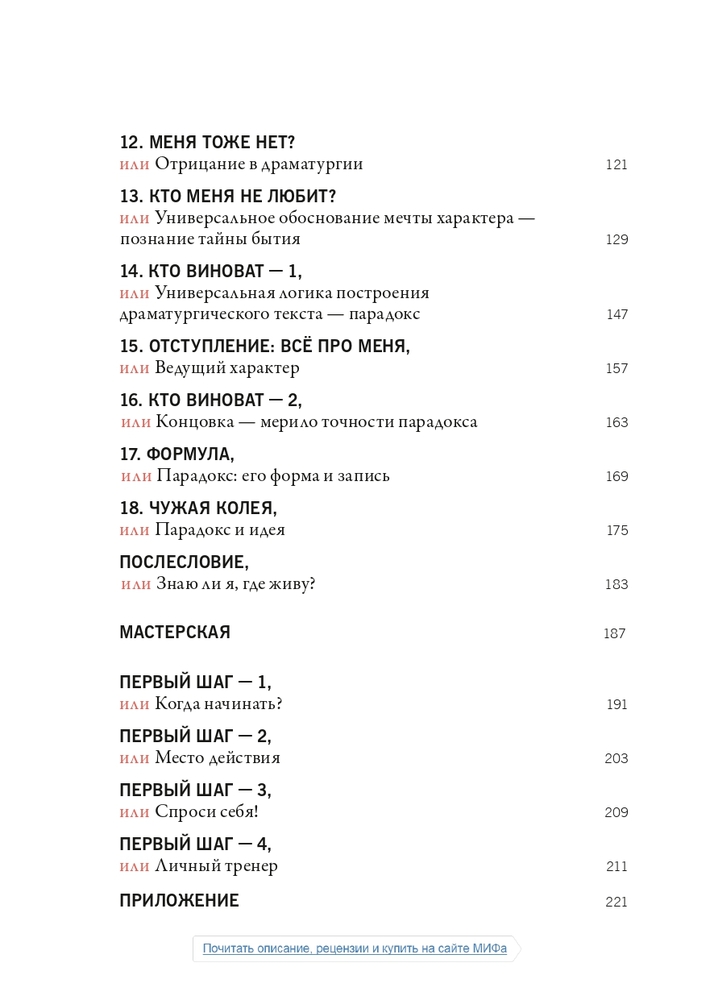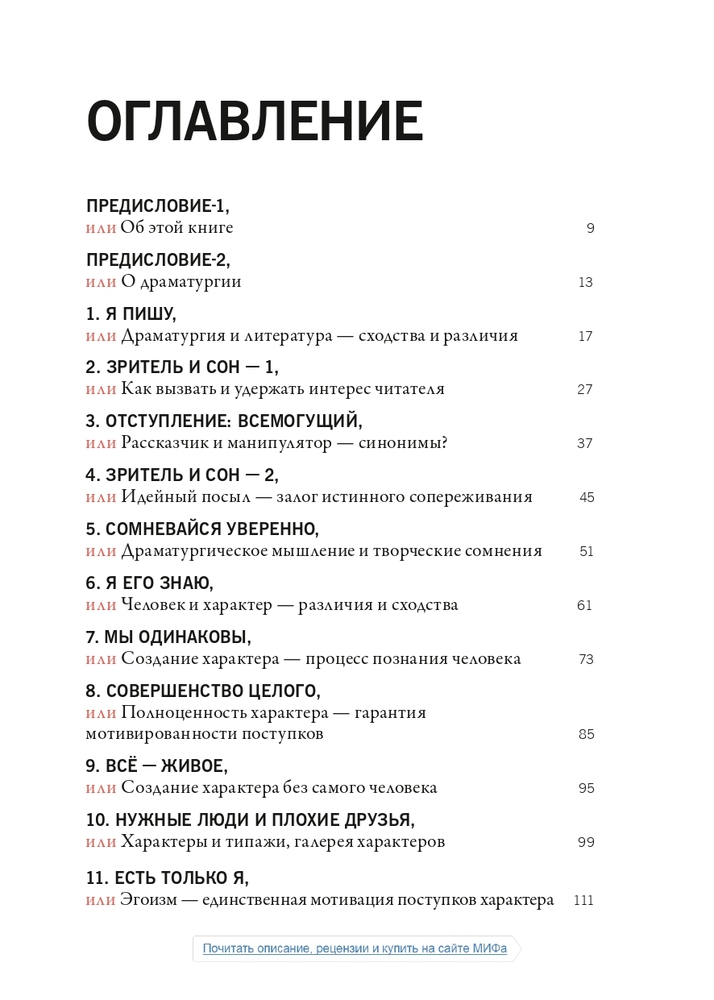 «Чего нельзя взять силой, того, как известно, можно добиться лаской и хитростью. Собственно, хитрости в любой деятельности и называются инструментами. Ласковая, но отточенная хитрость столяра — это рубанок и стамеска, портного — нитка с иголкой. Драматургия не исключение. В эту минуту полной растерянности, когда мы совершенно не понимаем, как уговорить зрителя высидеть в зале еще хоть чуточку, возьмем в руки инструмент помощнее: объясним причины действий наших героев, то есть снабдим героев мотивацией».