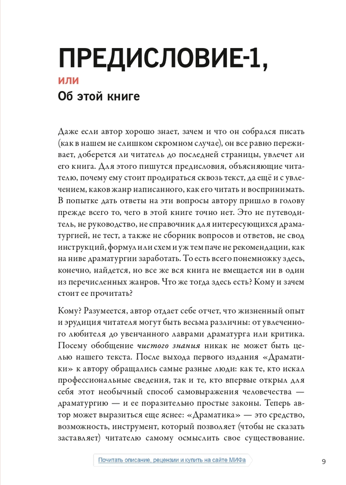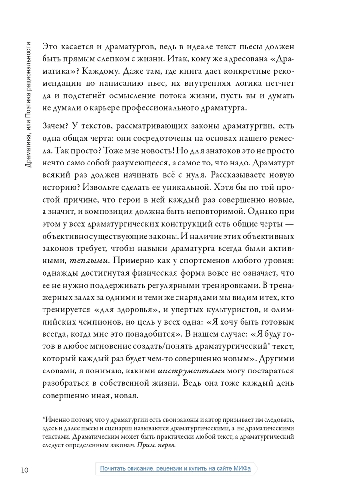 «В своей основе любая драматургическая, то есть представляемая публике, работа гораздо ближе к инструкции по пользованию холодильником, чем к роману. Чем понятнее будет инструкция, тем выше вероятность, что холодильник будет работать даже в руках неискушенного в технике покупателя, причем работать так, как предусмотрено конструктором.».