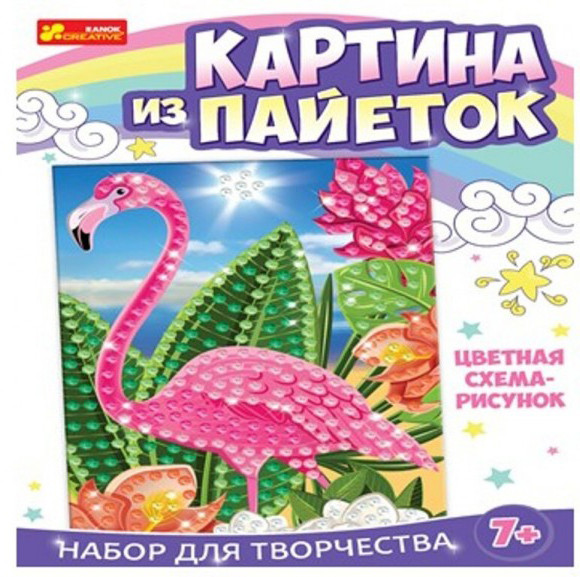 В комплект входит: основа из пенопласта, картинка, булавки, разноцветные пайетки и инструкция.