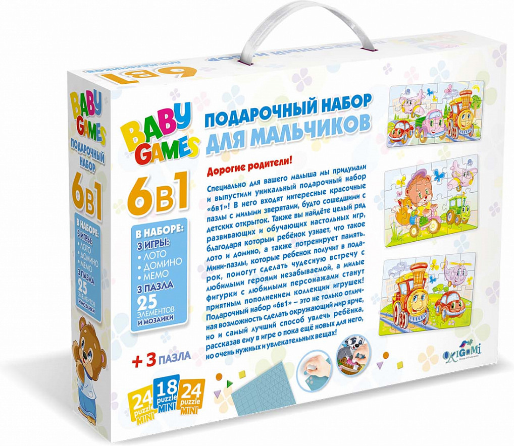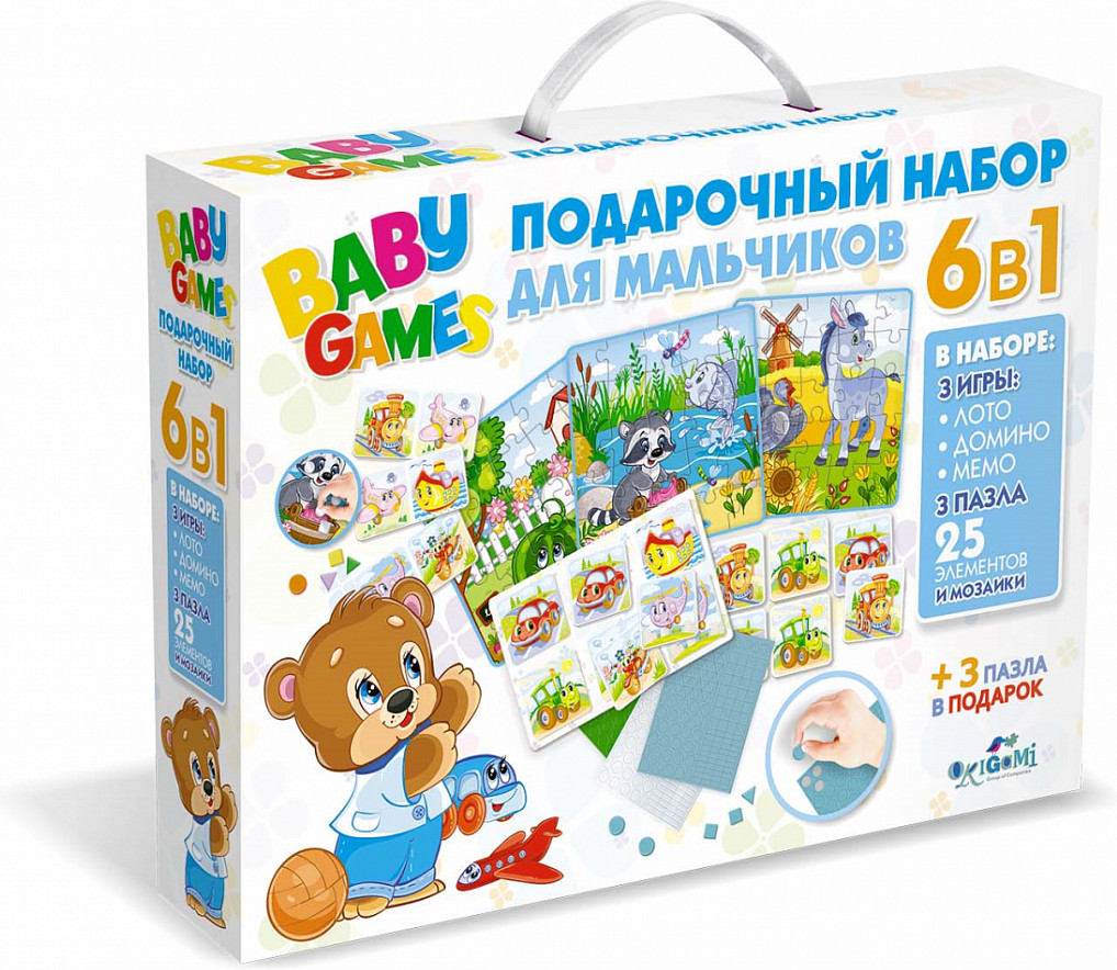 Подарочный набор 6 в 1 для мальчиков — это уникальный набор, включающий в себя интересные красочные пазлы с милыми зверятами, будто сошедшими в детских открыток, а также целый ряд развивающих и обучающих настольных игр, благодаря которым ребенок узнает, что такое лото и домино, а также потренирует память. Мини-пазлы, идущие в подарок к набору, помогут сделать чудесную встречу с любимыми героями незабываемой! |