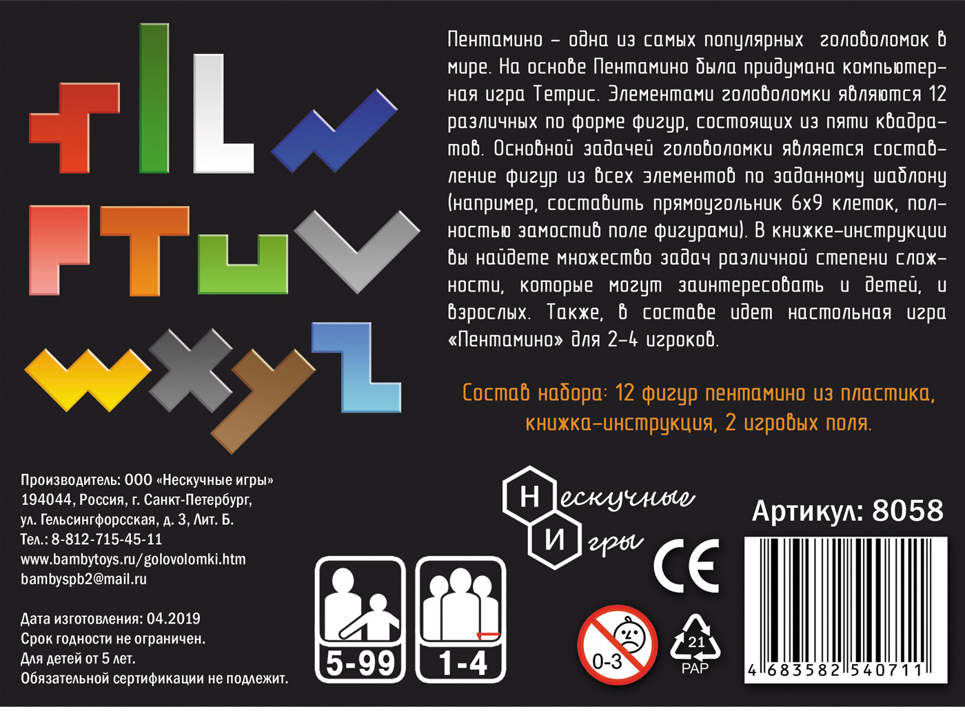 💳 Оплатить за товар можно при получении 🇰🇿 Есть бесплатная доставка по Казахстану от 1 дня 🎁 Копите бонусы с каждой покупки «Пентамино» — популярная логическая игра, на основе который был создан Тетрис. Пластиковые фигуры состоят из 5 квадратов. Основная задача — составить фигуры по заданному контуру, замостив всю поверхность без пропусков. |