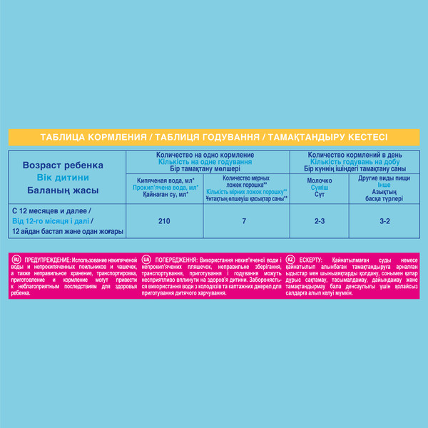 Предупреждение: молочко следует готовить непосредственно перед кормлением. Точно следуйте инструкции по приготовлению. Оставшееся после кормления молочко не подлежит хранению и последующему использованию. Во время кормления необходимо поддерживать ребенка, чтобы он не поперхнулся. Когда ребенок подрастет, переходите на кормление из чашки. Использование некипяченой воды и непрокипяченных поильников и чашечек, а также неправильное хранение, транспортировка, приготовление и кормление могут привести к неблагоприятным последствиям для здоровья ребёнка.