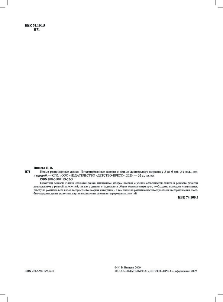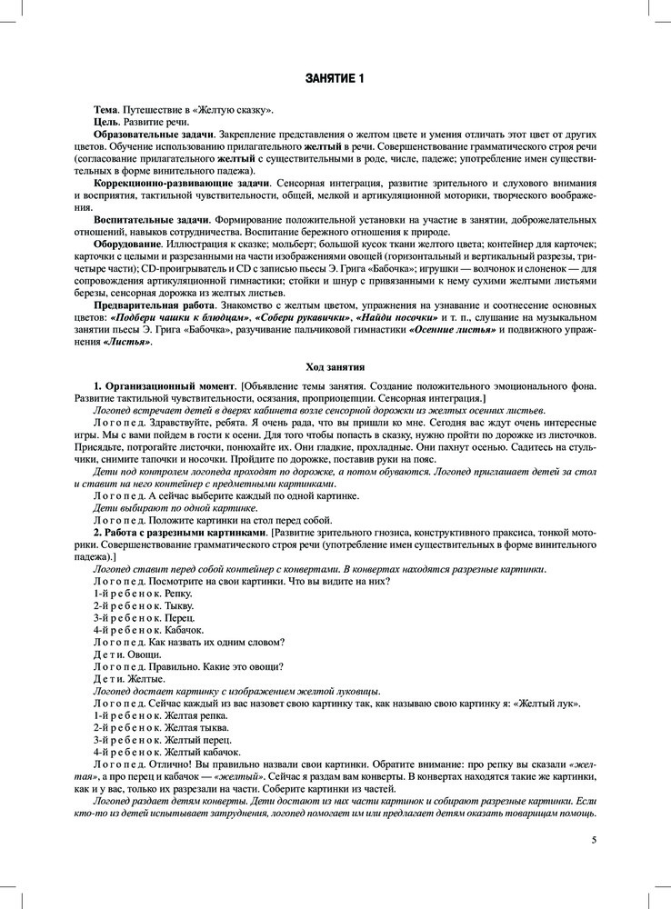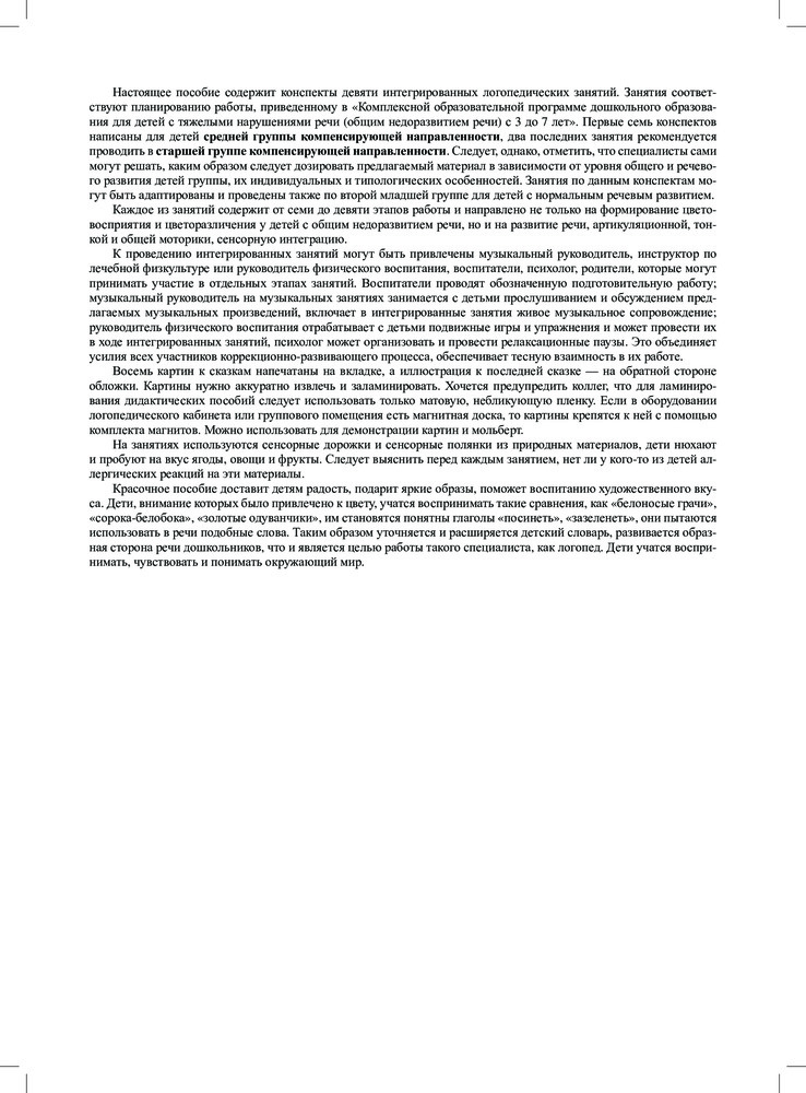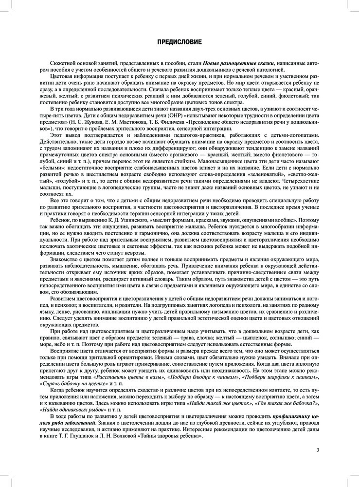 Серия: Развитие речи дошкольника Сюжетной основой издания являются сказки, написанные автором пособия с учетом особенностей общего и речевого развития дошкольников с речевой патологией, так как с детьми, страдающими общим недоразвитием речи, необходимо проводить специальную работу по развитию всех видов восприятия (сенсорная интеграция), в том числе по развитию цветовосприятия и цветоразличения. Пособие содержит девять сюжетных картин и конспекты девяти интегрированных занятий. |