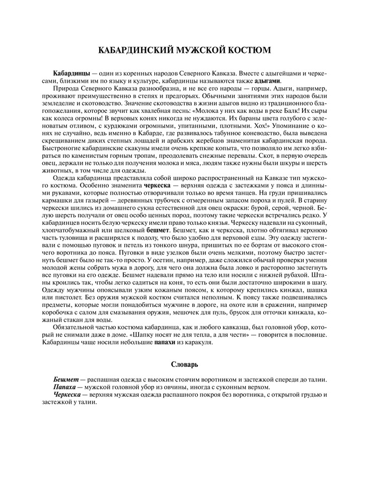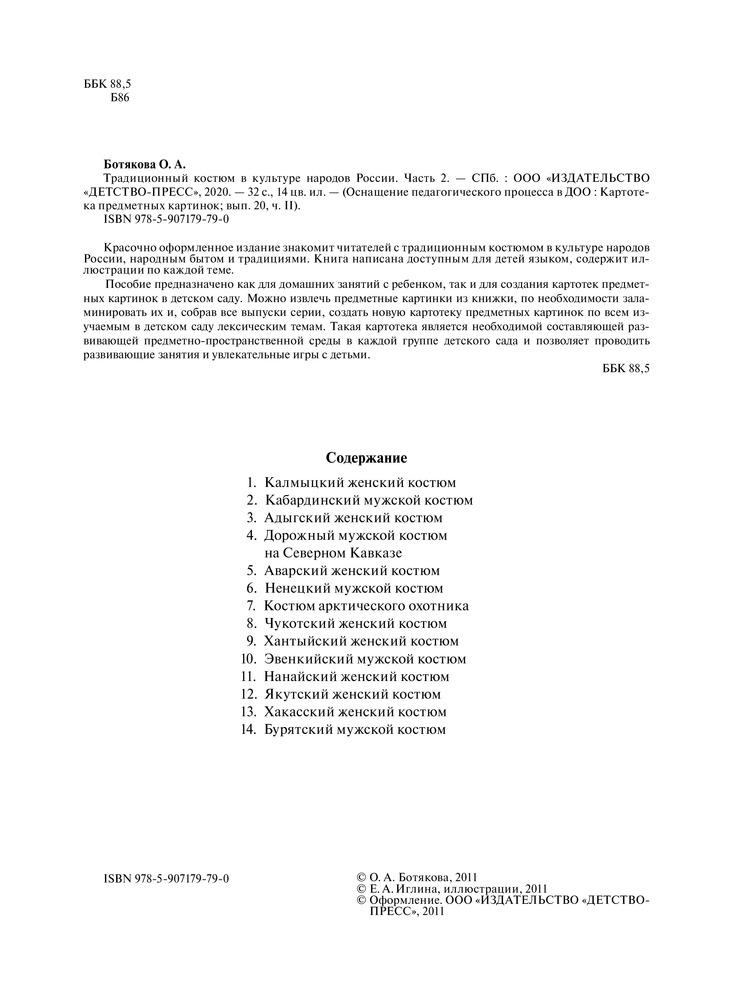 Картотека предметных картинок. Традиционный костюм в культуре народов России. Выпуск №20. Часть 2В данный момент этот товар отсутствует в продаже. Возможно, у нас найдется аналогичный или похожий товар здесь. Серия: Оснащение педагогического процесса в ДОУ Красочно оформленное издание знакомит читателей с традиционным костюмом в культуре народов России, народным бытом и традициями. Книга написана доступным для детей языком, содержит иллюстрации по каждой теме. Пособие предназначено как для домашних занятий с ребенком, так и для создания картотек предметных картинок в детском саду. Можно извлечь предметные картинки из книжки, по необходимости заламинировать их и, собрав все выпуски серии, создать новую картотеку предметных картинок по всем изучаемым в детском саду лексическим темам. Такая картотека является необходимой составляющей развивающей предметно-пространственной среды в каждой группе детского сада и позволяет проводить развивающие занятия и увлекательные игры с детьми. |