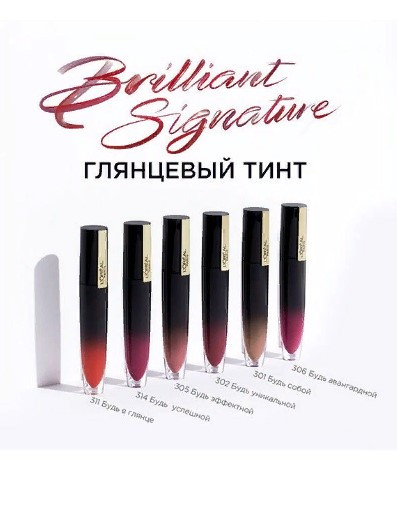 Глянцевый жидкий тинт для губ Brilliant Signature. Очень стильный, красивый дизайн. Пользуюсь чуть ли не каждый день. Я выбрала самый популярный оттенок 314. Удобная кисточка лодочка, позволяет равномерно и точно нанести помаду. Приятный аромат, без липкости, хорошо увлажняет губы, стойкость в течении дня.