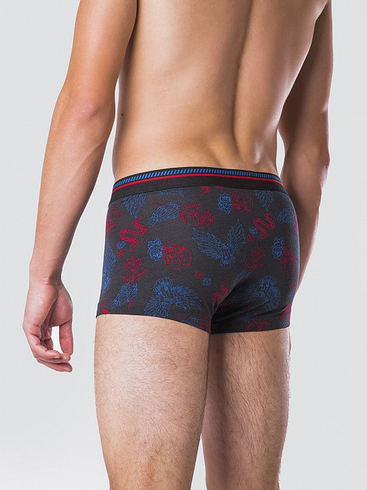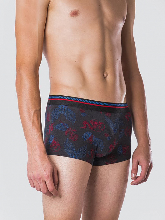 Трусы мужские из трикотажного полотна. Прилегающие. Без боковых швов с двумя передне-задними половинками. Планка и подкладка с вытачкой. Шаговый шов выполнен строчкой «флэт-лок». Швы притачивания планки выполнены на оверлоке с ширителем. По верхнему срезу настрочена фирменная жаккардовая эластичная тесьма. Боковые срезы тесьмы стачены строчкой флэт-лок. Нижние срезы трусов застрочены вподгиб.