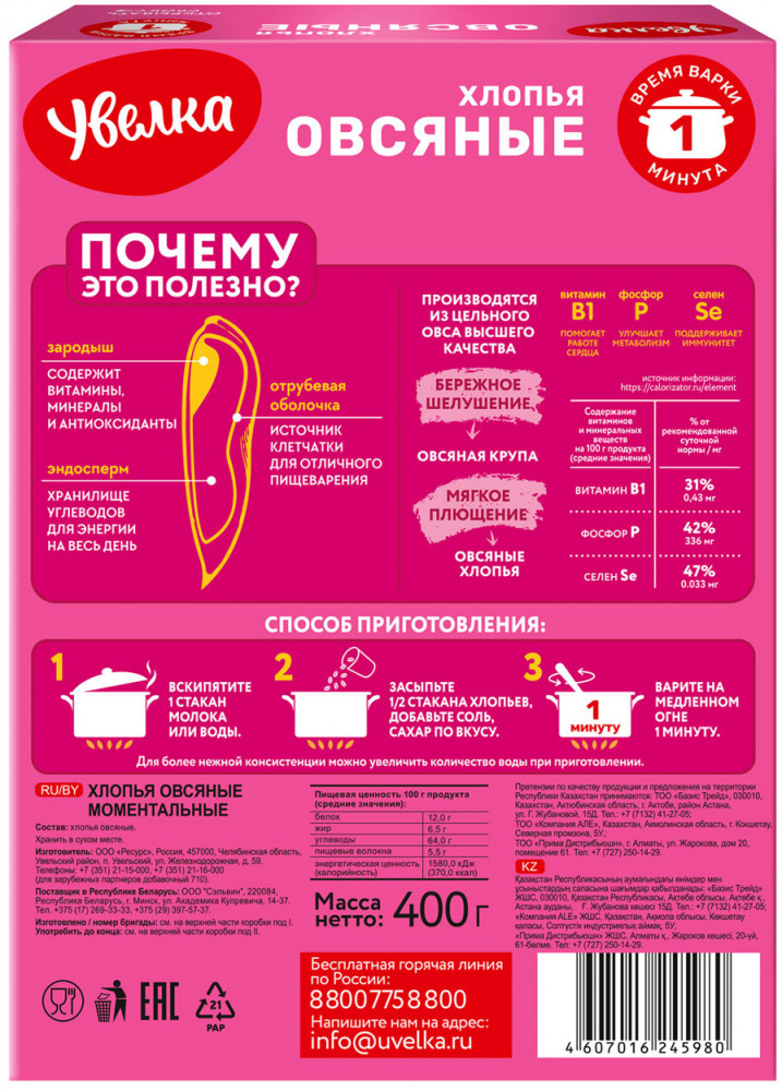 Увелка Хлопья овсяные «Моментальные»В данный момент этот товар отсутствует в продаже. Возможно, у нас найдется аналогичный или похожий товар здесь. Серия: Доброе утро Производство овсяных хлопьев быстрого приготовления осуществляется по специальной технологии, благодаря которой получается продукт с сохранением всех полезных и питательных свойств. Всего за одну минуту из этих хлопьев можно приготовить легкую, пышную и полезную кашу. Овсяные хлопья богаты белками, углеводами, калием, фосфором, цинком, витаминами группы В. А содержащиеся в хлопьях пищевые волокна улучшают пищеварение. Благодаря своей легкой, мягкой консистенции готовая каша подойдет для кормления маленьких детей. |