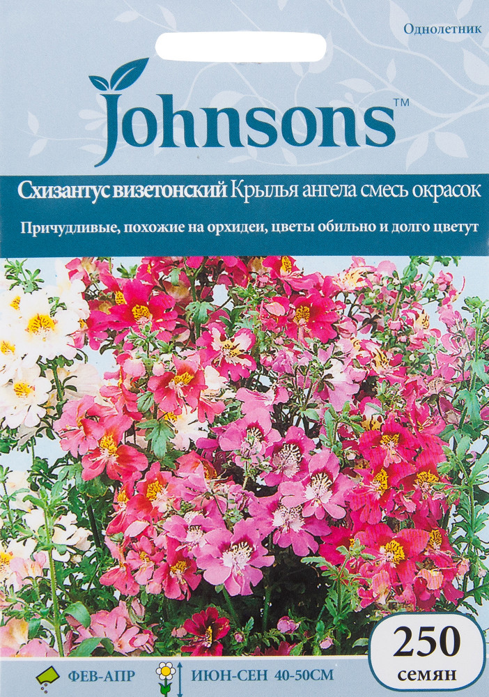 Johnsons Схизантус «Крылья ангела»В данный момент этот товар отсутствует в продаже. Возможно, у нас найдется аналогичный или похожий товар здесь. Схизантус — великолепное однолетнее растение высотой 40 см, ещё достаточно редко выращиваемое в садах, хотя вполне заслуживающее этого. Пёстрые цветки схизантуса, собранные в рыхлые верхушечные соцветия, по строению и экзотической окраске напоминают цветки орхидей и сплошь покрывают все растение с июня до осенних холодов. Поверхность цветков сплошь покрыта узорами разнообразных цветов и рисунков: цветными пятнами, крапинками, полосками. Выращивается рассадным способом. |