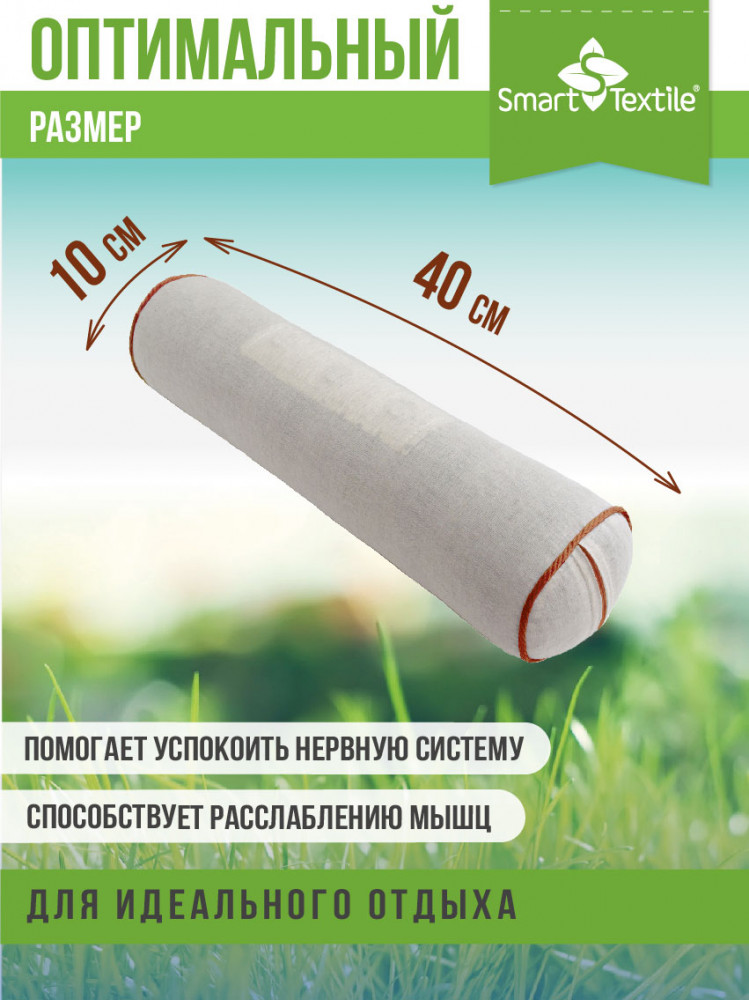 Ароматное растение — отличное успокоительное, прекрасно расслабляет, успокаивает, но в отличие от лекарственных препаратов, действует очень мягко. Утром вы почувствуете себя бодрым и полным сил. Продукция бренда «Smart Textile» сертифицирована, изготовлена из натуральных материалов. Чехол валика производится из льна, декорирована широкой оторочкой, сбоку находится молния, с помощью которой легко менять по желанию количество наполнителя, а значит и степень упругости..
