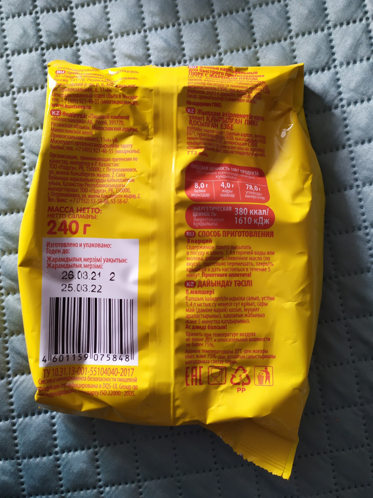 Потрясающе))) Раньше брали "зуко" и просто добавляли воды. А для приготовления пюре нужно: содержимое пакета высыпать в посуду и залить 1,4 литра горячей воды или молока, добавить сливочное масло (по вкусу), тщательно перемешать, закрыть крышкой и дать настояться в течении 5 минут. И вот ты повар-профессионал)))) Спасибо, Флип.кз. Рекомендую.