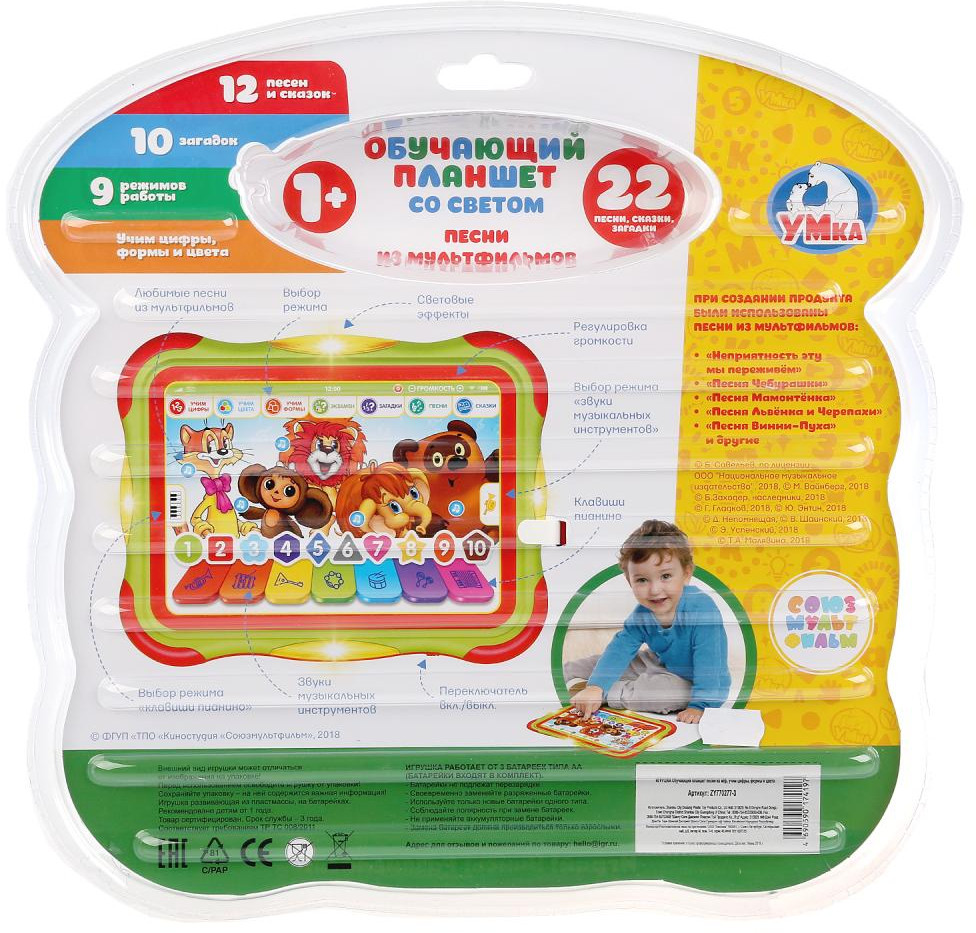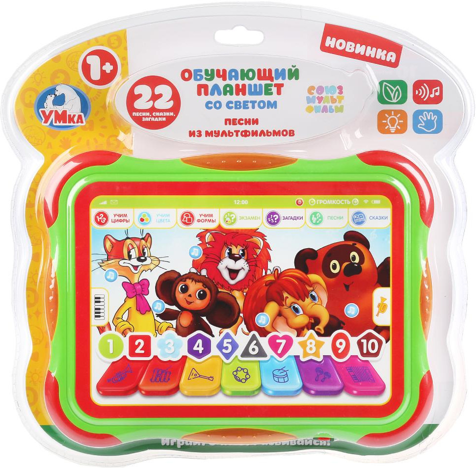 УМка Планшет обучающий «Союзмультфильм»В данный момент этот товар отсутствует в продаже. Возможно, у нас найдется аналогичный или похожий товар здесь. Ваш ребенок и не заметит, как научится правильно называть основные цвета и геометрические фигуры, а также выучит цифры и простой счет в игре со своим новым планшетом. |
