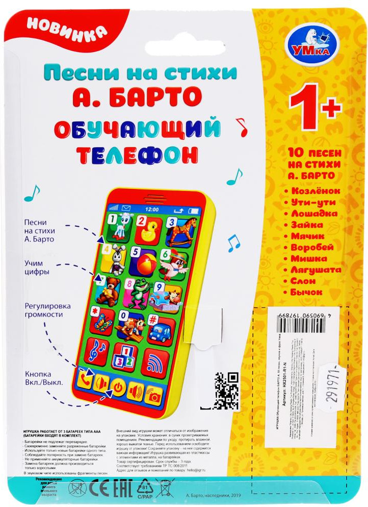 УМка Телефон обучающий «Песни и стихи А.Барто»В данный момент этот товар отсутствует в продаже. Возможно, у нас найдется аналогичный или похожий товар здесь. Теперь собственный телефон появится и у вашего малыша, только кроха будет не звонить, а слушать весёлые песенки, звуки и фразы. Таким образом досуг ребенка станет одновременно увлекательным и полезным для его кругозора, а также слуха. |