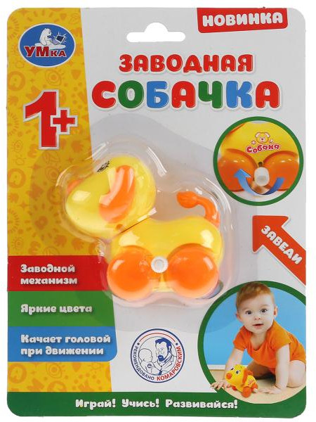 Игрушка классная, очень понравилась. Ребенку 10 месяцев, ползает за ней, изучает. Собачка заводная, когда катится, то голова и хвост шевелятся. Забавная вещица, можно смело на подарок.