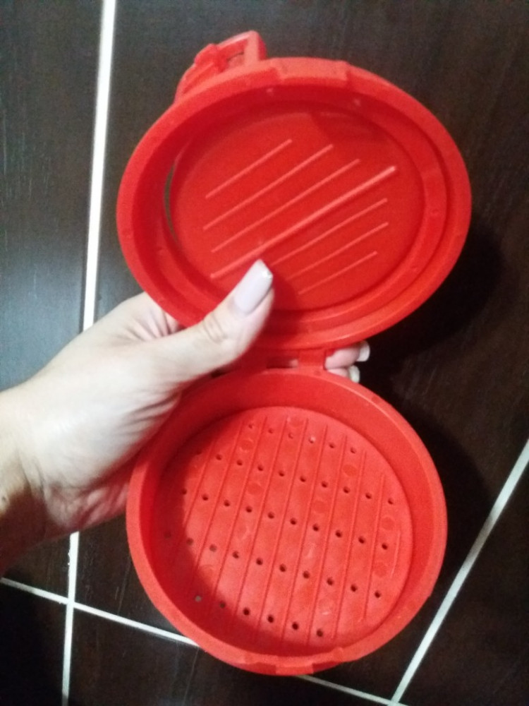Пластик хороший. В деле не пробовала, диаметр котлеты почти 11 см., а часть для наполнения 9 см.