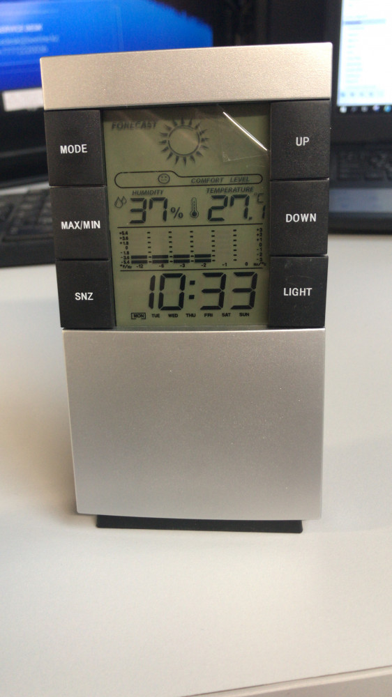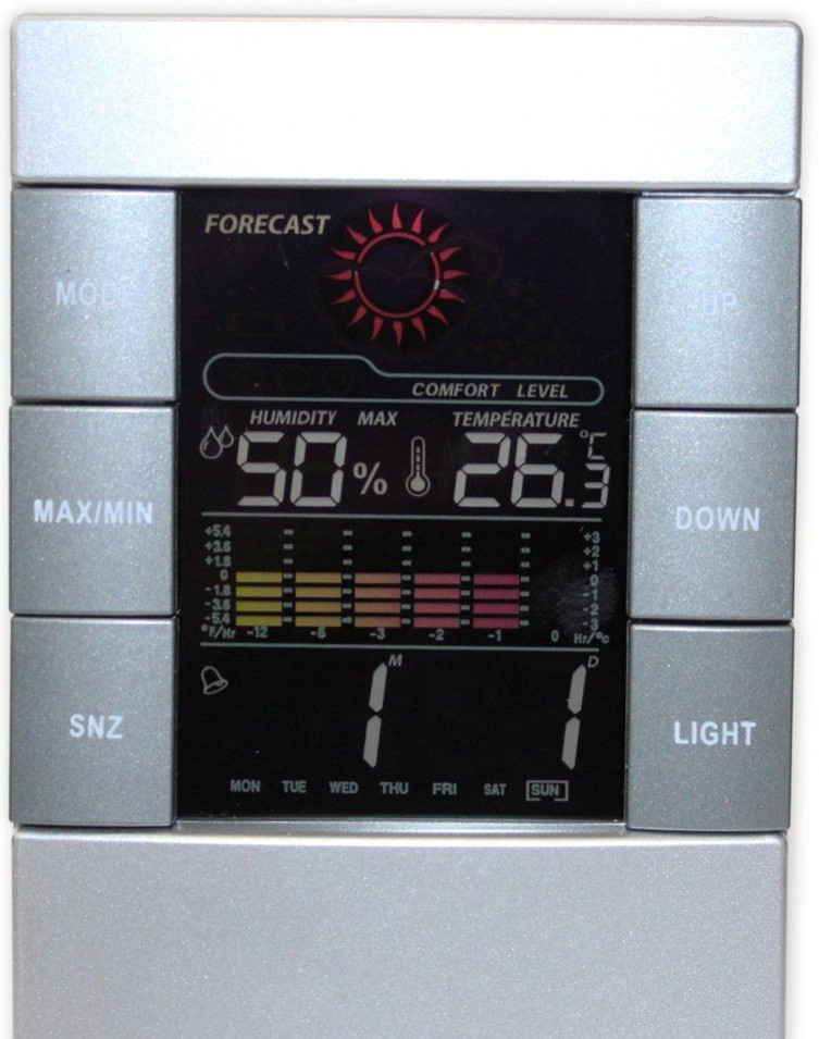 К сожалению, это не метеостанция, а простой домашний градусник с будильником и часами. Да, показывает температуру, но в помещении.