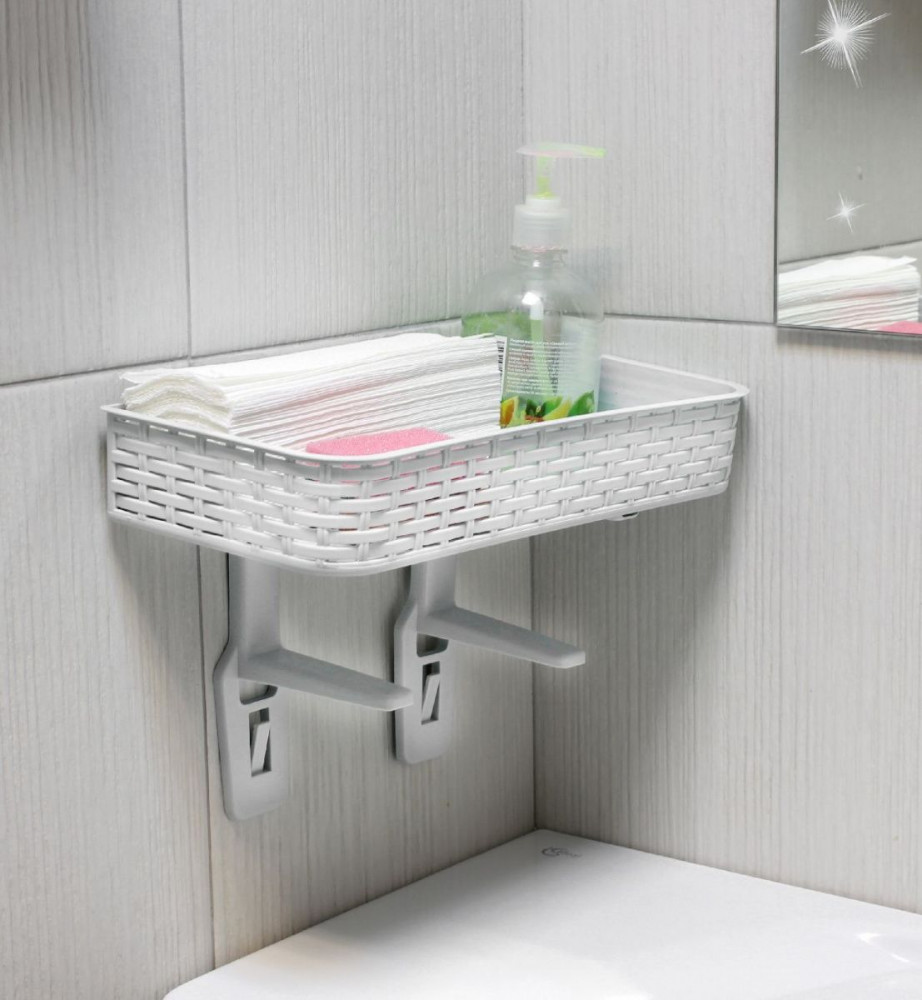 Плетеная полка для мелких хозяйственных принадлежностей и бытовых средств обеспечит компактное хранение кухонного инвентаря и косметических средств. Ножки-крючки дают возможность разместить на них полотенца и тряпки, а так же позволяет расположить полку стационарно на горизонтальной поверхности. Клейкие держатели обеспечивают надежное крепление к стене, не повреждая поверхность плитки и кафеля.