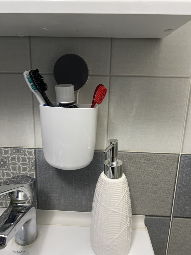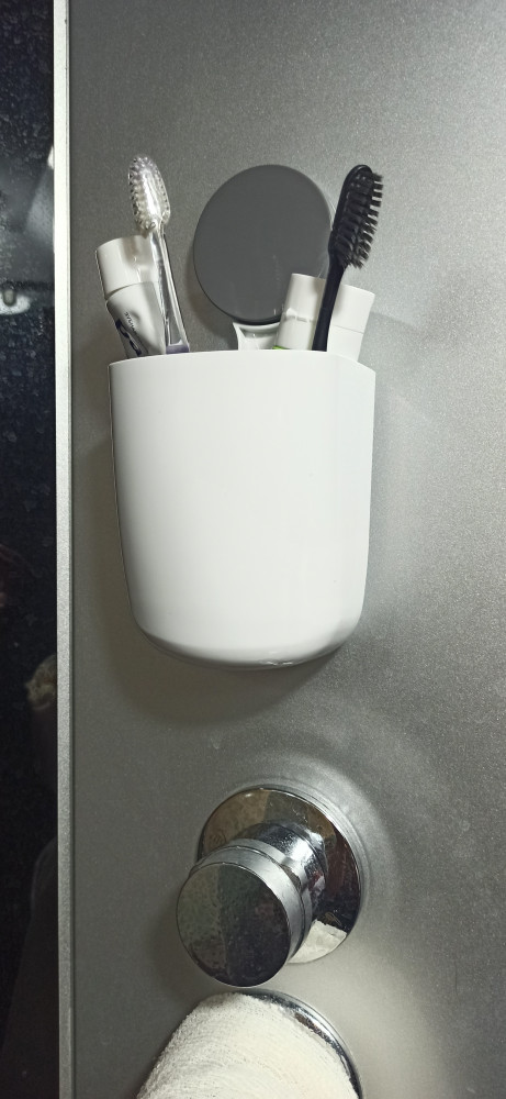 Отличный стакан, вместительный. Прикрепилось отлично, с первого раза, устойчив к влаге. У нас висит в душевой кабине, так как мало полок, очень выручило. Рекомендую!